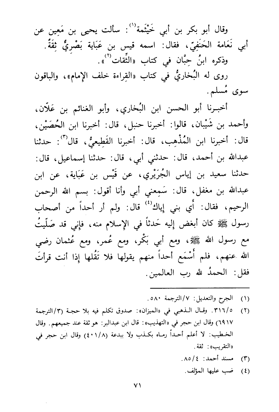 أَخْبَرَنَا أَبُو الْحَسَنُ بْنُ الْبُخَارِيِّ، وأَبُو الْغَنَائِمِ بْن علان، وأحمد بْن شيبان، قَالُوا: أخبرنا حنبل، قال: أخبرنا ابْنُ الْحُصَيْنِ، قال: أخبرنا ابْنُ الْمُذْهِب، قال: أخبرنا القَطِيعِيّ، قال (3) : حَدَّثَنَا عَبد اللَّهِ بْنُ أَحْمَدَ، قال: حَدَّثني أبي، قال: حَدَّثَنَا إِسْمَاعِيل، قال: حَدَّثَنَا سَعِيد بْن إياس الجريري، عَنْ قَيْس بْن عباية، عَنِ ابْن عَبد اللَّهِ بْن مغفل، قال: سمعني أَبِي وأنا أقول: بسم الله الرحمن الرحيم، فَقَالَ: أي بني إياك (4) قال: ولم أر أحدا من أصحاب رَسُولَ صَلَّى اللَّهُ عَلَيْهِ وسَلَّمَ كَانَ أبغض إليه حدثا في الإسلام منه، فإني قد صليت مَعَ رَسُولِ اللَّهِ صَلَّى اللَّهُ عليه وسلم، ومع أَبِي بَكْر، ومع عُمَر، ومع عُثْمَان رضي الله عنهم، فلم أسمع أحدا منهم يقولها فلا تقلها إذا أنت قرأت فقل: الحمد لله رب العالمين.