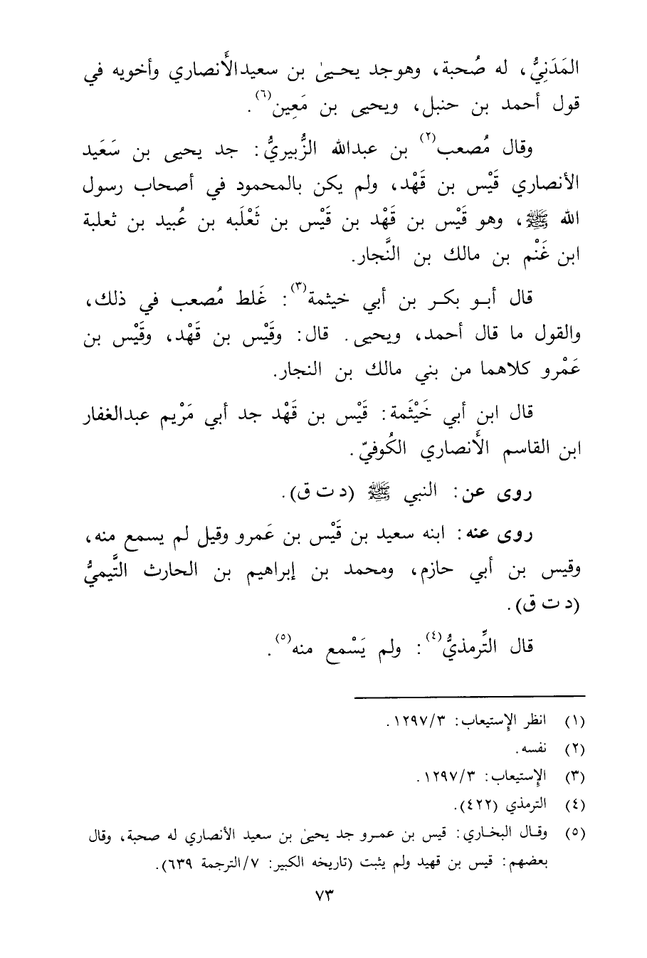 (5) وقَال البُخارِيُّ: قيس بن عَمْرو جد يَحْيَى بْن سَعِيد الأَنْصارِيّ لهُ صُحبَةٌ، وَقَال بعضهم: قيس بن قهيد ولم يثبت (تاريخه الكبير: 7 / الترجمة 639) .