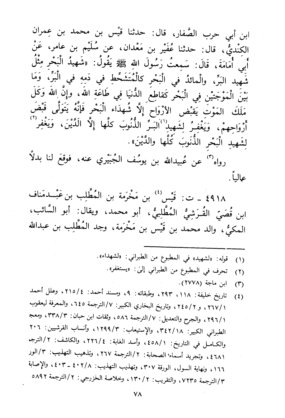 4918 - ت: قَيْس بْن مخرمة بْن المطلب بْن عبد مناف ابن قصي القرشي المطلبي (4) ، أَبُو مُحَمَّد، ويُقال: أَبُو السَّائِب، المكي، والد مُحَمَّد بْن قيس بْن مخرمة، وجد المطلب بْن عَبد اللَّهِ
