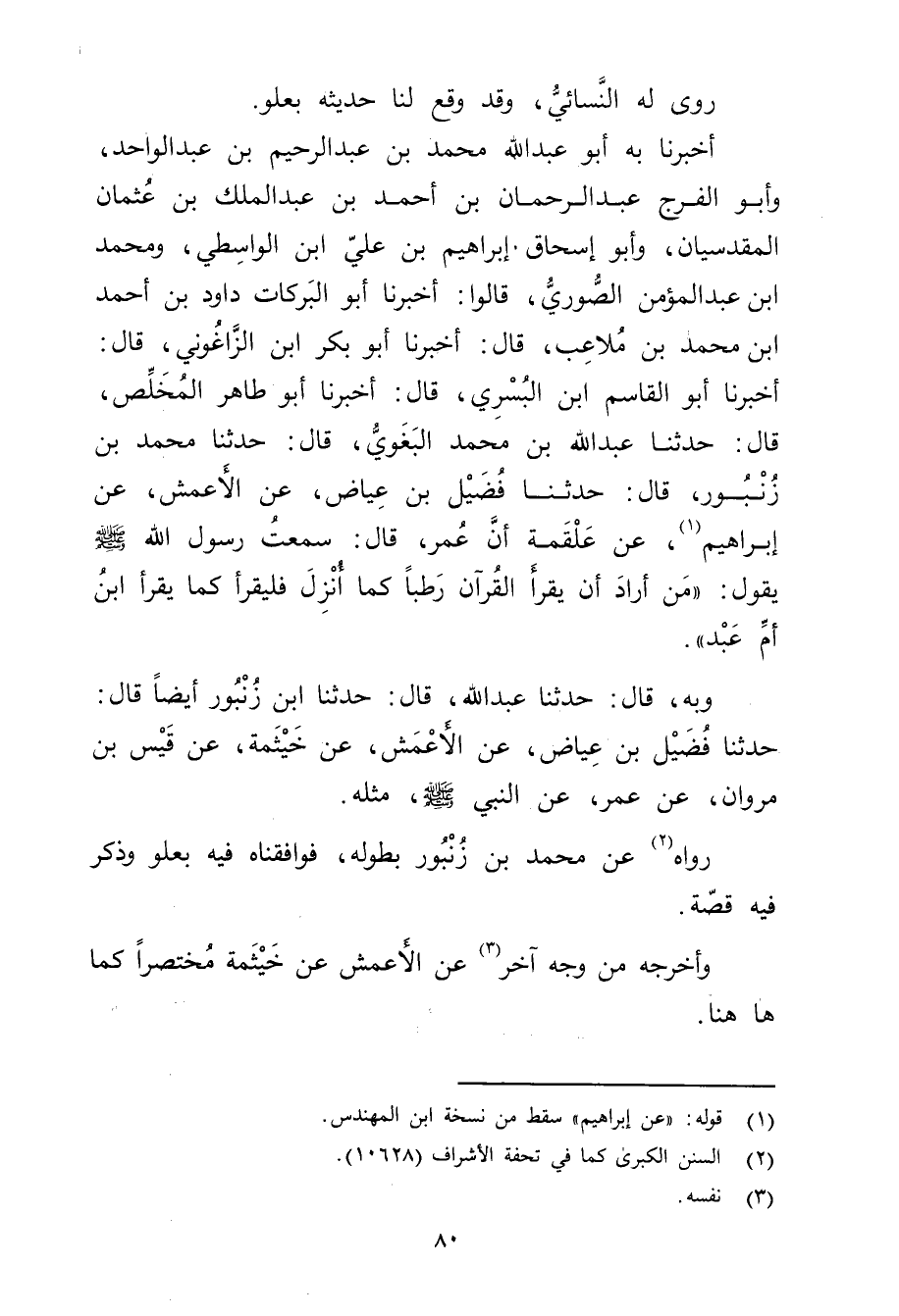أخبرنا به أَبُو عَبْد اللَّهِ مُحَمَّد بْن عَبد الرَّحِيمِ بْنِ عَبْدِ الْوَاحِدِ، وأبو الفرج عَبْد الرَّحْمَنِ بْن أَحْمَد بْن عَبد المَلِك بْن عُثْمَانَ الْمَقْدِسِيَّانِ، وأَبُو إِسْحَاقَ: إِبْرَاهِيمُ بن علي ابن الواسطي، ومحمد ابن عبد المؤمن الصُّورِيُّ، قَالُوا: أَخْبَرَنَا أَبُو الْبَرَكَاتِ دَاوُدُ بْنُ أَحْمَدَ بْنِ مُحَمَّدِ بْنِ مُلاعِبٍ، قال: أَخْبَرَنَا أَبُو بَكْر بْن الزاغوني، قال: أَخْبَرَنَا أبو القاسم ابن الْبُسْرِيِّ، قال: أَخْبَرَنَا أَبُو طَاهِرٍ الْمُخَلِّصُ، قال: حَدَّثَنَا عَبد اللَّهِ بْنُ مُحَمَّدٍ الْبَغَوِيُّ، قال: حَدَّثَنَا مُحَمَّدُ بْنُ زُنْبُورٍ، قال: حَدَّثَنَا فضيل بْن عياض، عَنِ الأعمش، عَنْ إِبْرَاهِيمَ (1) ، عَنْ عَلْقَمَةَ أَنَّ عُمَر، قال: سَمِعْتُ رَسُولَ اللَّهِ صَلَّى اللَّهُ عَلَيْهِ وسَلَّمَ يقول: "مَنْ أَرَادَ أَنْ يَقْرَأَ الْقُرْآنَ رَطْبًا كَمَا أُنْزِلَ فَلْيَقْرَأْ كَمَا يَقْرَأُ ابْنُ أُمِّ عَبْدٍ.