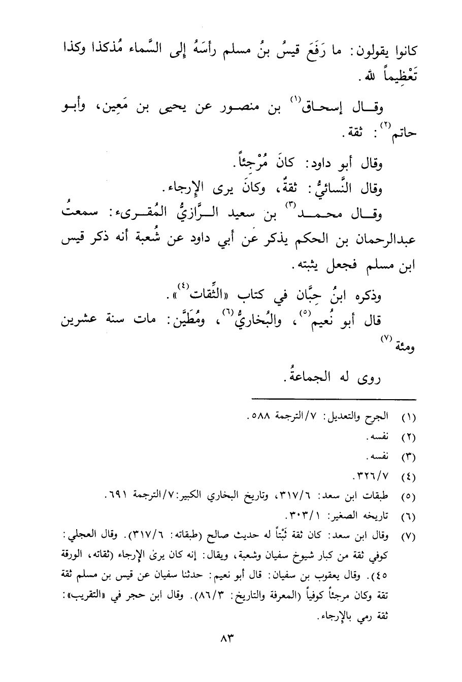 (7) وَقَال ابن سعد: كان ثقة ثبتا له حديث صالح (طبقاته: 6 / 317) . وَقَال العجلي: كوفي ثقة من كبار شيوخ سفيان وشعبة. ويُقال: إنه كان يرى الارجاء (ثقاته، الورقة 45) .