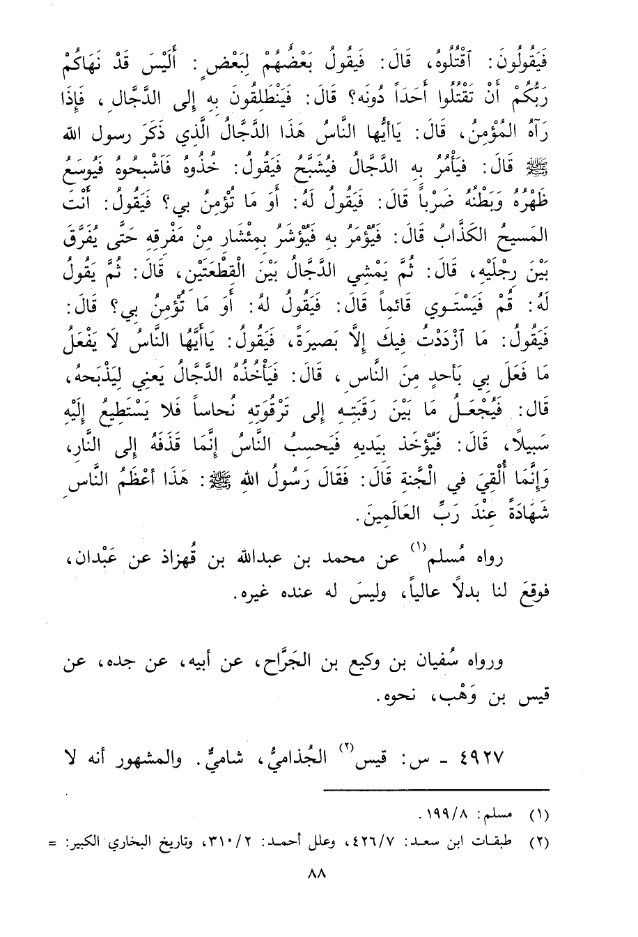 فَيَقُولُونَ: اقْتُلُوهُ، قال: فَيَقُولُ بَعْضُهُمْ لِبَعْضٍ: أَلَيْسَ قَدْ نَهَاكُمْ رَبُّكُمْ أَنْ تَقْتُلُوا أَحَدًا دُونَهُ؟ قال: فَيَنْطَلِقُونَ بِهِ إِلَى الدَّجَّالِ، فَإِذَا رَآهُ الْمُؤْمِنُ، قال: يَا أَيُّهَا النَّاسُ هَذَا الدَّجَّالُ الَّذِي ذَكَرَ رَسُول اللَّهِ صلى الله عليه وسلم قال: فَيَأْمُرُ بِهِ الدَّجَّالُ فَيُشَبَّحُ فَيَقُولُ: خُذُوهُ فَاشْبِحُوهُ فَيُوسَعُ ظَهْرُهُ وبَطْنُهُ ضَرْبًا قال: فَيَقُولُ لَهُ: أَوَ مَا تُؤْمِنُ بِي؟ فَيَقُولُ: أَنْتَ الْمَسِيحُ الْكَذَّابُ قال: فيؤمر به فيؤشر بمئشار مِنْ مَفْرِقِهِ حَتَّى يُفَرَّقَ بَيْنَ رِجْلَيْهِ، قال: ثُمَّ يَمْشِي الدَّجَّالُ بَيْنَ الْقِطْعَتَيْنِ، قال: ثُمَّ يَقُولُ لَهُ: قُمْ فَيَسْتَوِي قَائِمًا قال: فَيَقُولُ لَهُ: أَوَ مَا تُؤْمِنُ بِي؟ قال: فَيَقُولُ: مَا ازْدَدْتُ فِيكَ إِلا بَصِيرَةً، فَيَقُولُ: يَا أَيُّهَا النَّاسُ لا يَفْعَلُ مَا فَعَلَ بِي بِأَحَدٍ مِنَ النَّاسِ، قال: فَيَأْخُذُهُ الدَّجَّالُ يَعْنِي لِيَذْبَحَهُ، قال: فَيَجْعَلُ مَا بَيْنَ رَقَبَتِهِ إِلَى تَرْقُوَتِهِ نُحَاسًا فَلا يَسْتَطِيعُ إِلَيْهِ سَبِيلا، قال: فَيُؤْخَذُ بِيَدَيْهِ فَيَحْسِبُ النَّاسُ إِنَّمَا قَذَفَهُ إِلَى النَّارِ، وإِنَّمَا أُلْقِيَ فِي الْجَنَّةِ قال: فَقَالَ رَسُولُ اللَّهِ صَلَّى الله عليه وسلم: هَذَا أَعْظَمُ النَّاسِ شَهَادَةً عِنْدَ رَبِّ الْعَالَمِينَ.