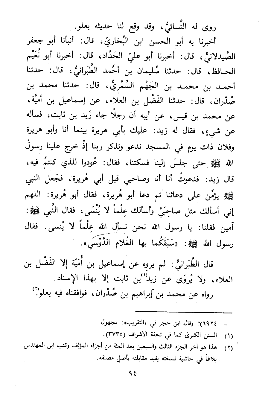 أخبرنا به أبو الحسن بْن البخاري، قال: أَنْبَأَنَا أَبُو جَعْفَرٍ الصَّيْدَلانِيُّ، قال: أَخْبَرَنَا أَبُو عَلِيّ الحداد، قال: أَخْبَرَنَا أبو نعيم الحافظ، قال: حَدَّثَنَا سُلَيْمان بْنُ أَحْمَدَ الطَّبَرَانِيُّ، قال: حَدَّثَنَا أَحْمَد بْن مُحَمَّد بْن الجهم السمري، قال: حَدَّثَنَا مُحَمَّدُ بْنُ صَدْرَانَ، قال: حَدَّثَنَا الْفَضْل بْن الْعَلاء، عَنْ إِسْمَاعِيل بْن أمية، عَنْ مُحَمَّد بْن قَيْس، عَن أَبِيهِ أن رجلا جاء زَيْد بْن ثَابِت، فسأله عَنْ شيء، فَقَالَ له زَيْد: عليك بأبي هُرَيْرة بينما أنا وأَبُو هُرَيْرة وفلان ذات يَوْم في المسجد ندعو ونذكر ربنا إذ خرج علينا رَسُول اللَّهِ صَلَّى اللَّهُ عَلَيْهِ وسَلَّمَ حَتَّى جلس إلينا فسكتنا، فَقَالَ: عودوا للذي كنتم فيه، قال زَيْد: فدعوت أنا أنا وصاحبي قبل أَبِي هُرَيْرة، فَجَعَلَ النَّبِيُّ صَلَّى اللَّهُ عَلَيْهِ وسلم يؤمن على دعائنا ثُمَّ دعا أَبُو هُرَيْرة، فَقَالَ أَبُو هُرَيْرة: اللهم إِنِّي أسألك مثل صاحبي وأسألك علما لا ينسى، فَقَالَ النَّبِيُّ صَلَّى اللَّهُ عَلَيْهِ وسلم: آمين فقلنا: يَا رَسُول اللَّهِ نحن نسأل الله علما لا ينسى. فَقَالَ رَسُول اللَّهِ صلى الله عليه وسلم: "سبقكما بها الغلام الدوسي.