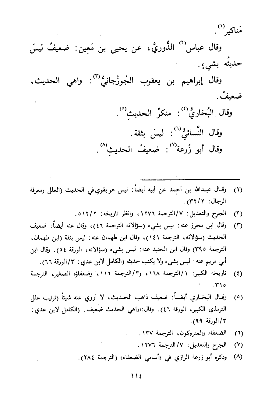 (5) وقَال البُخارِيُّ أيضا: ضعيف ذاهب الحديث، لا أروي عنه شيئا (ترتيب علل التِّرْمِذِيّ الكبير، الورقة 46) . وَقَال: واهي الحديث ضعيف. (الكامل لابن عدي: 3 / الورقة 99) .