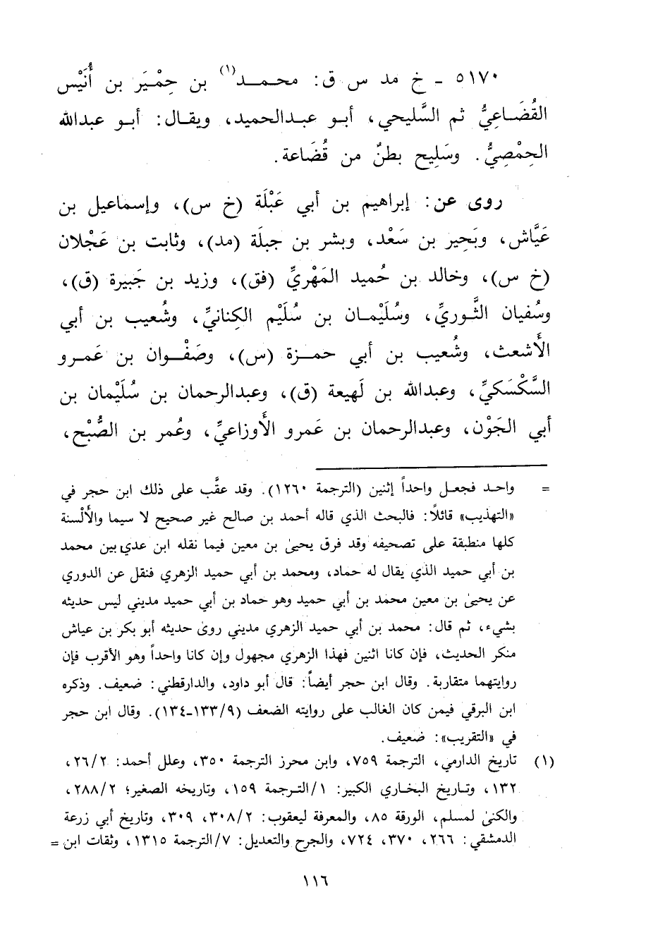 5170 - خ مد س ق: مُحَمَّد بن حمير بن أنيس القضاعي ثم السليحي (1) ، أبو عبد الحميد، ويُقال: أبو عبد الله الحمصي. وسليح بطن من قضاعة.