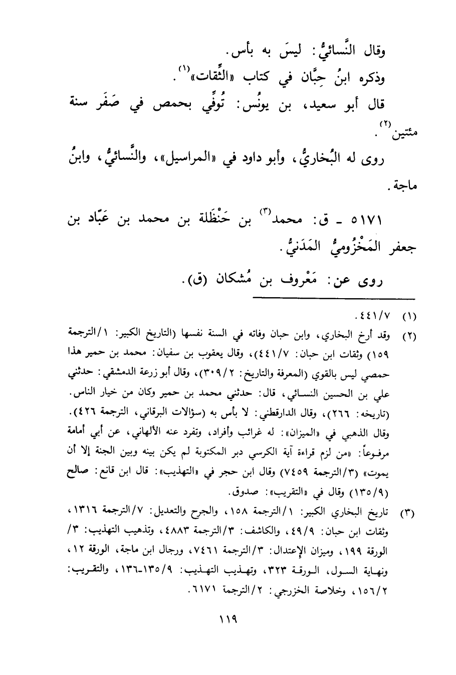(3) تاريخ البخاري الكبير: 1 / الترجمة 158، والجرح والتعديل: 7 / الترجمة 1316، وثقات ابن حبان: 9 / 49، والكاشف: 3 / الترجمة 4883، وتذهيب التهذيب: 3 / الورقة 199، وميزان الاعتدال: 3 / الترجمة 7461، ورجال ابن ماجة، الورقة 12، ونهاية السول، الورقة 323، وتهذيب التهذيب: 9 / 135 - 136، والتقريب: 2 / 156، وخلاصة الخزرجي: 2 / الترجمة 6171.