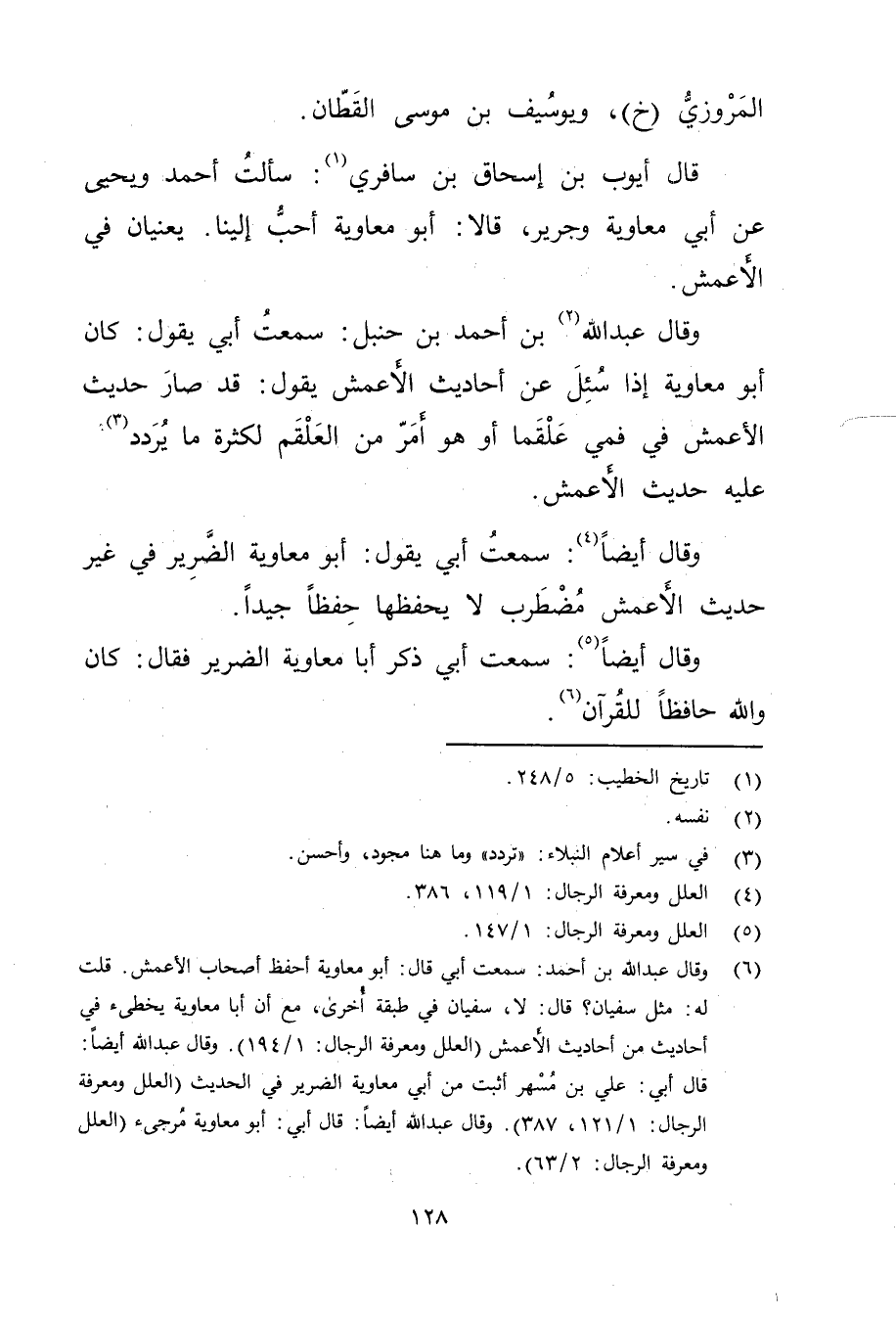 (6) وَقَال عَبد اللَّهِ بْن أَحْمَد: سمعت أبي قال: أبو معاوية أحفظ أصحاب الأعمش. قلت له: مثل سفيان؟ قال: لا، سفيان في طبقة أخرى، مع أن أبا معاوية يخطئ في أحاديث من أحاديث الأعمش (العلل ومعرفة الرجال: 1 / 194) . وَقَال عَبد الله أيضا: قال أبي: علي بن مسهر أثبت من أَبِي معاوية الضرير في الحديث (العلل ومعرفة الرجال: 1 / 121، 387) .