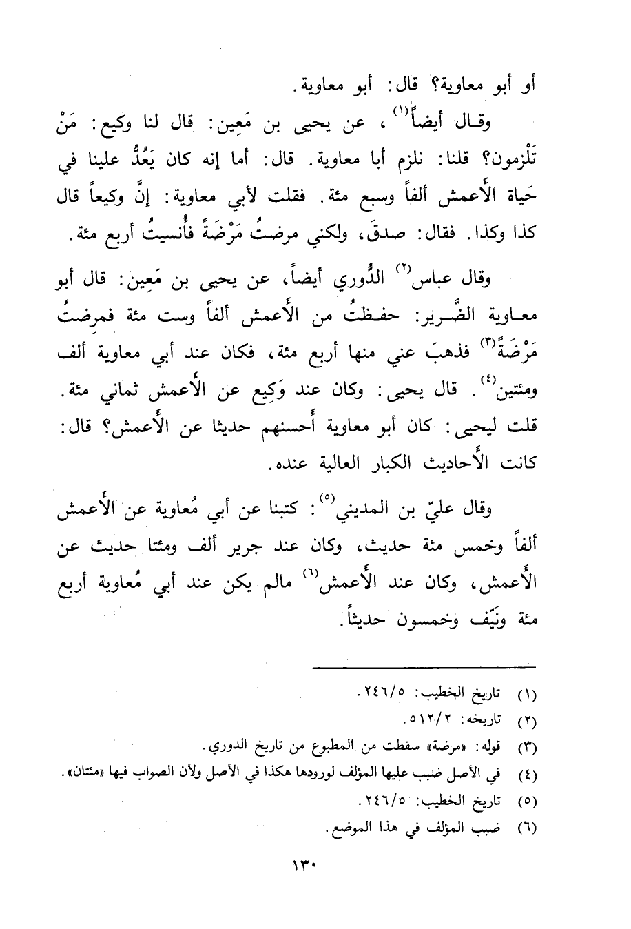وَقَال عباس (2) الدوري أيضا، عن يَحْيَى بْن مَعِين: قال أَبُو معاوية الضرير: حفظت من الأعمش الفا وست مئة فمرضت مرضة (3) فذهب عني منها اربع مئة، فكان عند أبي معاوية ألف ومئتين (4) . قال يحيى: وكان عند وكيع عن الاعمش ثماني مئة. قلت ليحيى: كان أبو معاوية أحسنهم حديثا عن الأعمش؟ قال: كانت الأحاديث الكبار العالية عنده.
