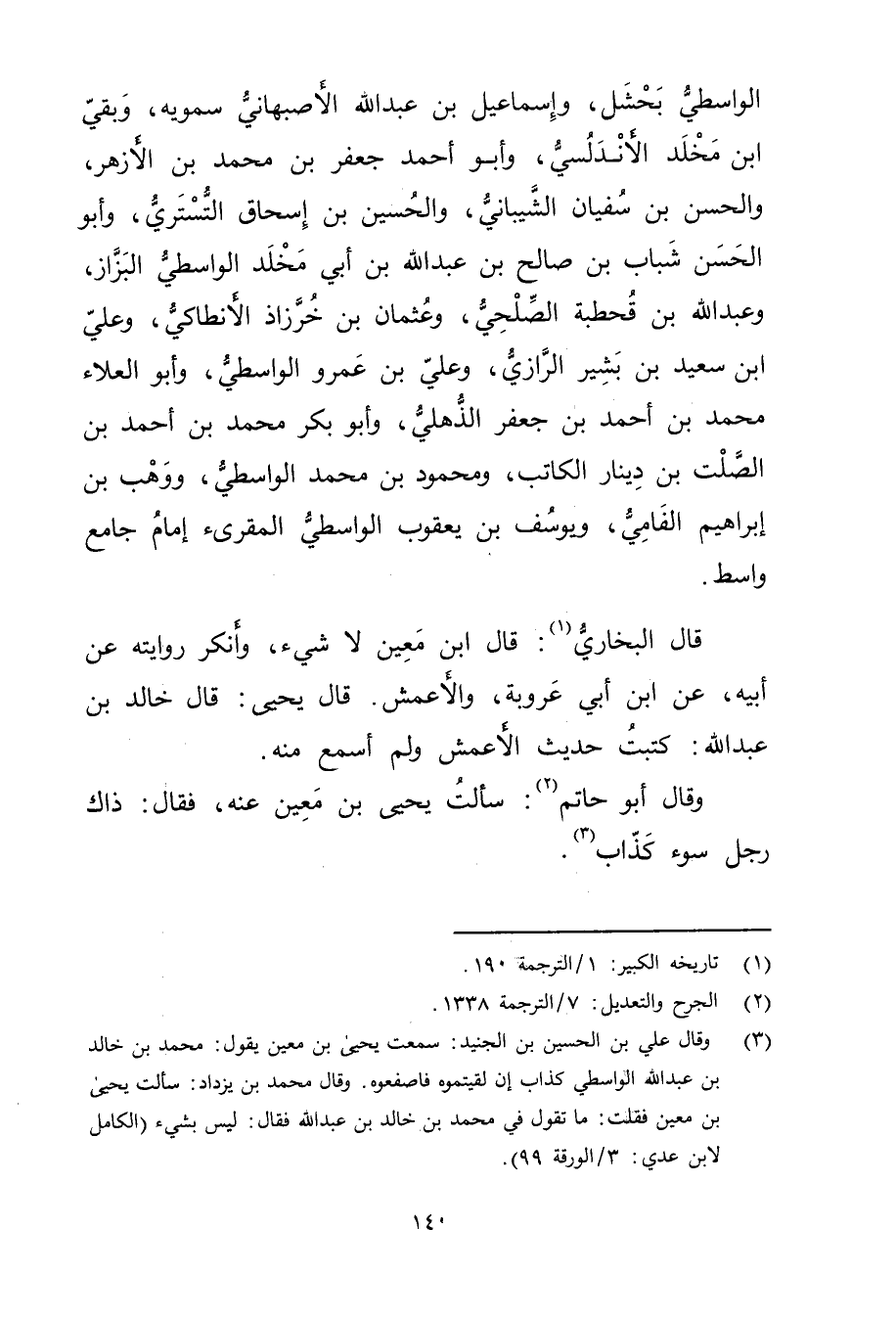 (3) وَقَال علي بْن الحسين بْن الجنيد: سمعت يَحْيَى بن مَعِين يقول: مُحَمَّد بْن خالد بْن عَبد الله الواسطي كذاب إن لقيتموه فاصفعوه. وَقَال محمد بن يزداد: سألت يَحْيَى بْن مَعِين فَقُلْتُ: ما تقول فِي مُحَمَّد بْن خالد بن عَبد الله فقال: ليس بشيءٍ (الكامل لابن عدي: 3 / الورقة 99) .