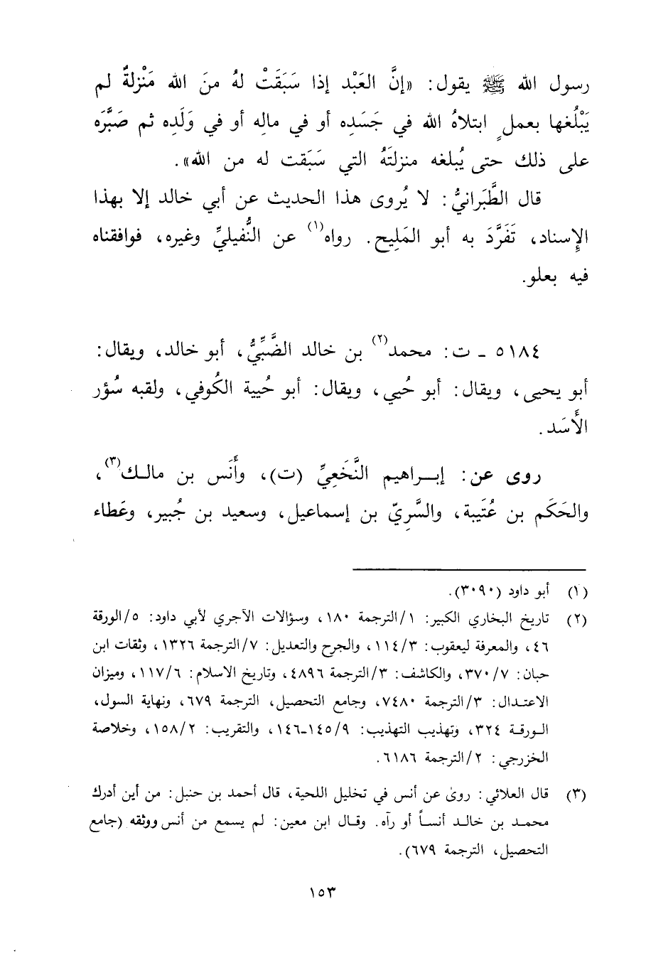 (3) قال العلائي: روى عن أنس في تخليل اللحية، قال أحمد بن حنبل: من أين أدرك محمد بن خالد أنسا أو رآه. وَقَال ابن مَعِين: لم يسمع من أنس ووثقه (جامع التحصيل، الترجمة 679) .