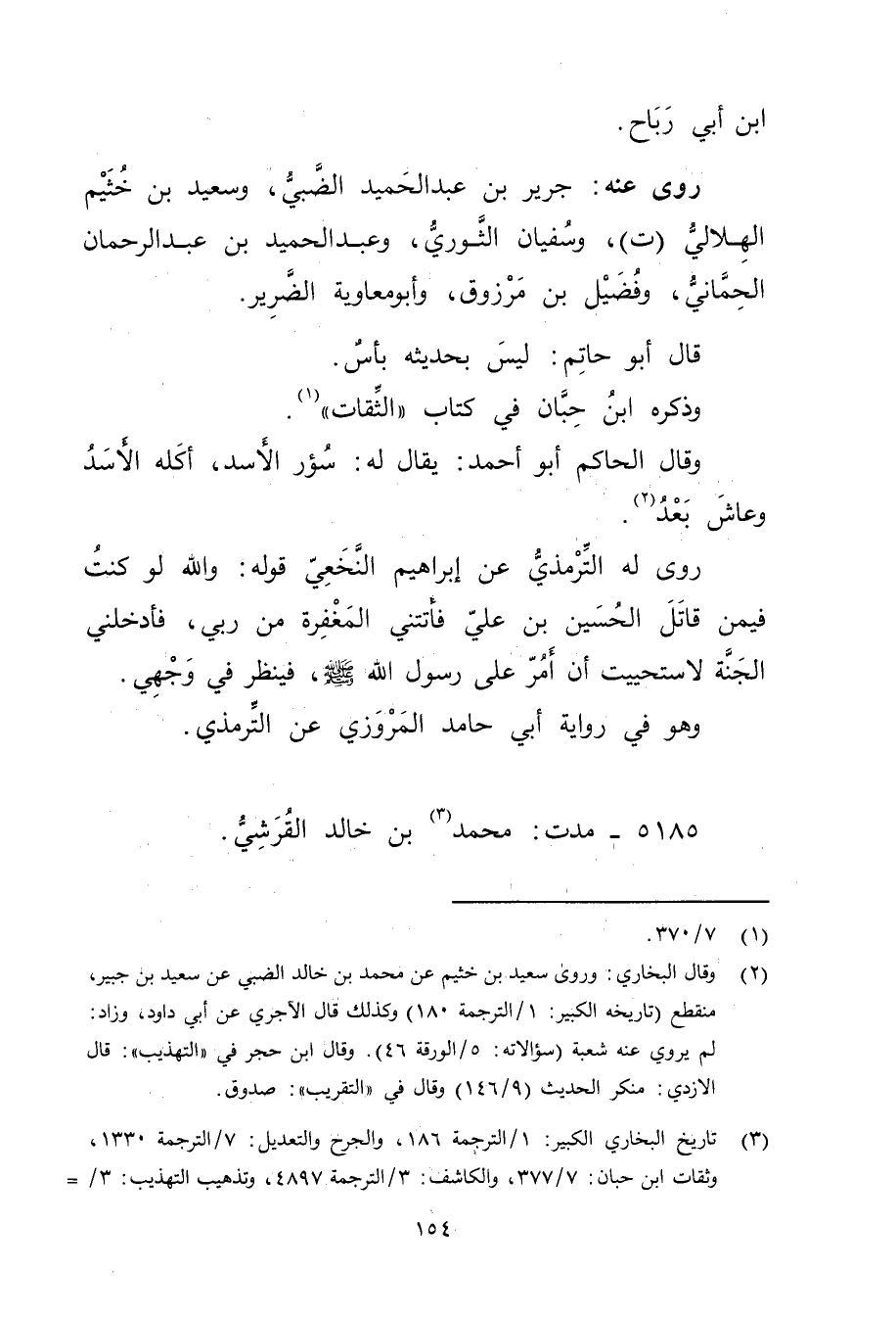 (3) تاريخ البخاري الكبير: 1 / الترجمة 186، والجرح والتعديل: 7 / الترجمة 1330، وثبات ابن حبان: 7 / 377، والكاشف: 3 / الترجمة 4897، وتذهيب التهذيب: 3 / =
