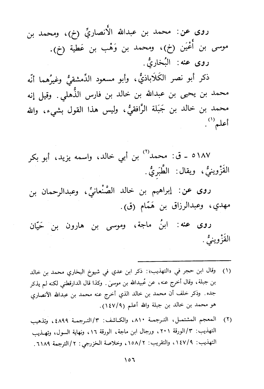 (2) المعجم المشتمل، الترجمة 810، والكاشف: 3 / الترجمة 4899، وتذهيب التهذيب: 3 / الورقة 201، ورجال ابن ماجة، الورقة 16، ونهاية السول، وتهذيب التهذيب: 9 / 147، والتقريب: 2 / 158، وخلاصة الخزرجي: 2 / الترجمة 6189.