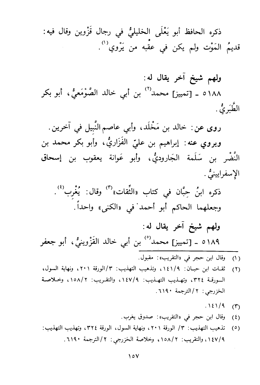 (5) تذهيب التهذيب: 3 / الورقة 201، ونهاية السول، الورقة 324، وتهذيب التهذيب: 9 / 147، والتقريب: 2 / 158، وخلاصة الخزرجي: 2 / الترجمة 6190.