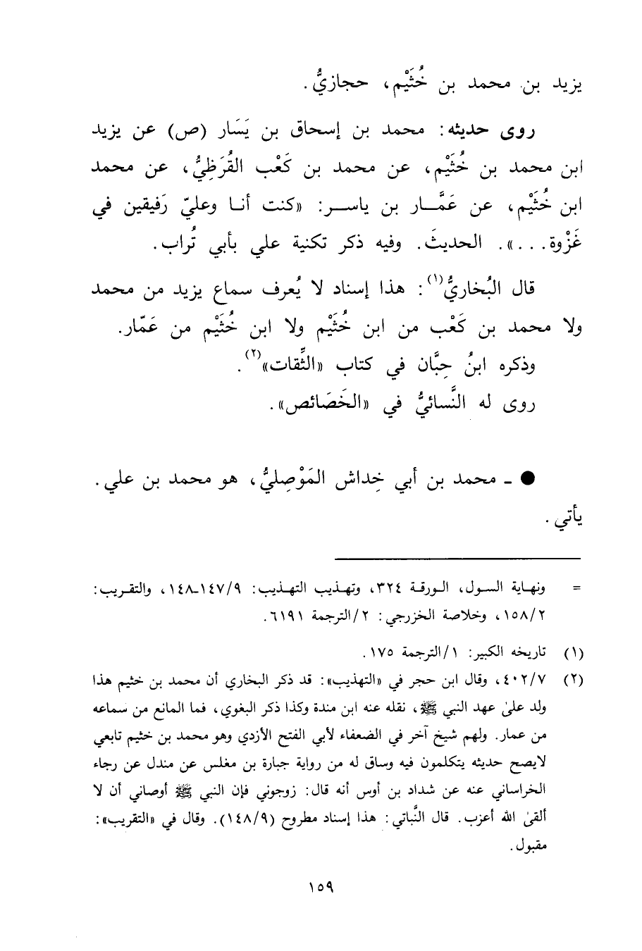قال البخاري (1) : هذا إسناد لا يعرف سماع يزيد من مُحَمَّد ولا مُحَمَّد بن كعب من ابْن خثيم ولا ابْن خثيم من عمار.