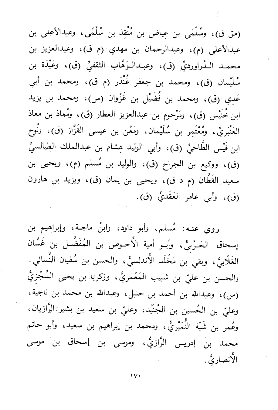 رَوَى عَنه: مسلم، وأَبُو دَاوُدَ، وابن مَاجَهْ، وإبراهيم بْن إسحاق الحربي، وأَبُو أمية الأَحوص بْن المفضل بْن غسان الغلابي، وبقي بن مخلد الأندلسي، والحسن بْن سُفْيَان النَّسَائي. والحسن بْن علي بْن شبيب المعمري، وزكريا بْن يحيى السجزي (س) ، وعبد الله بن أَحْمَد بْن حنبل، وعبد الله بْن مُحَمَّد بْن ناجية، وعلي بْن الحسين بْن الجنيد، وعلي بْن سَعِيد بن بشير: الرازيان، وعُمَر بْن شبة النميري، ومحمد بْن إِبْرَاهِيم بن سَعِيد، وأبو حاتم مُحَمَّد بْن إدريس الرازي، وموسى بْن إسحاق بْن مُوسَى الأَنْصارِيّ.