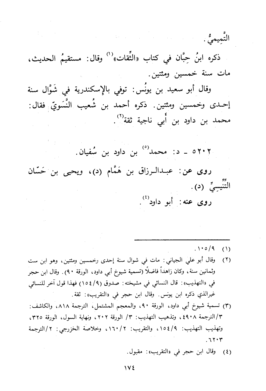 (3) تسمية شيوخ أبي داود، الورقة 90، والمعجم المشتمل، الترجمة 818، والكاشف: 3 / الترجمة 4908، وتذهيب التهذيب: 3 / الورقة 202، ونهاية السول، الورقة 325، وتهذيب التهذيب: 9 / 154، والتقريب: 2 / 160، وخلاصة الخزرجي: 2 / الترجمة 6203.