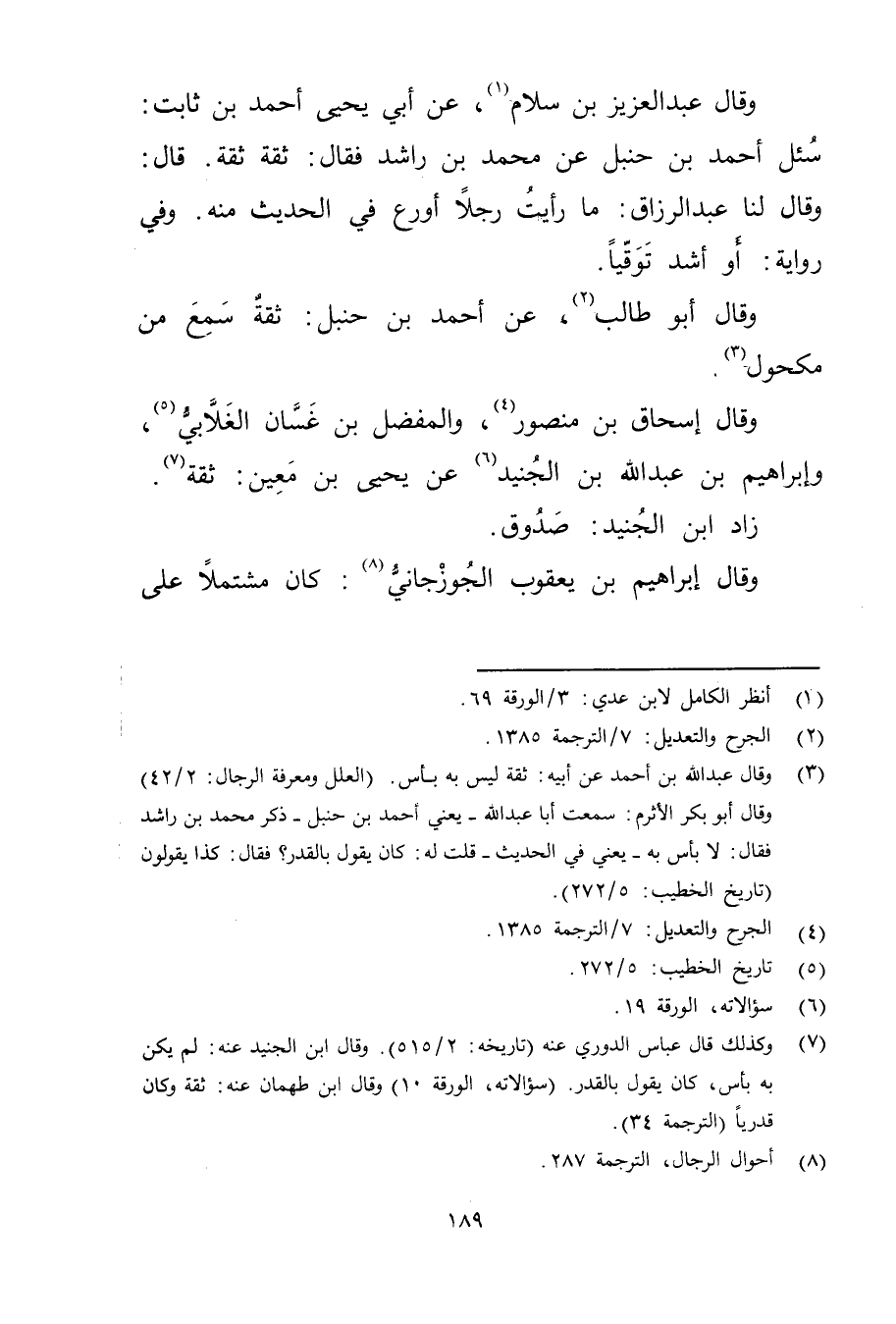 (3) وَقَال عَبد اللَّهِ بْن أَحْمَد عَن أبيه: ثقة ليس بِهِ بأس. (العلل ومعرفة الرجال: 2 / 42) وَقَال أبو بكر الأثرم: سمعت أَبَا عَبد اللَّهِ، يعني أَحْمَد بن حنبل - ذكر محمد بن راشد فقال: لا بأس به، يعني في الحديث - قلت له: كان يقول بالقدر؟ فقال: كذا يقولون (تاريخ الخطيب: 5 / 272) .