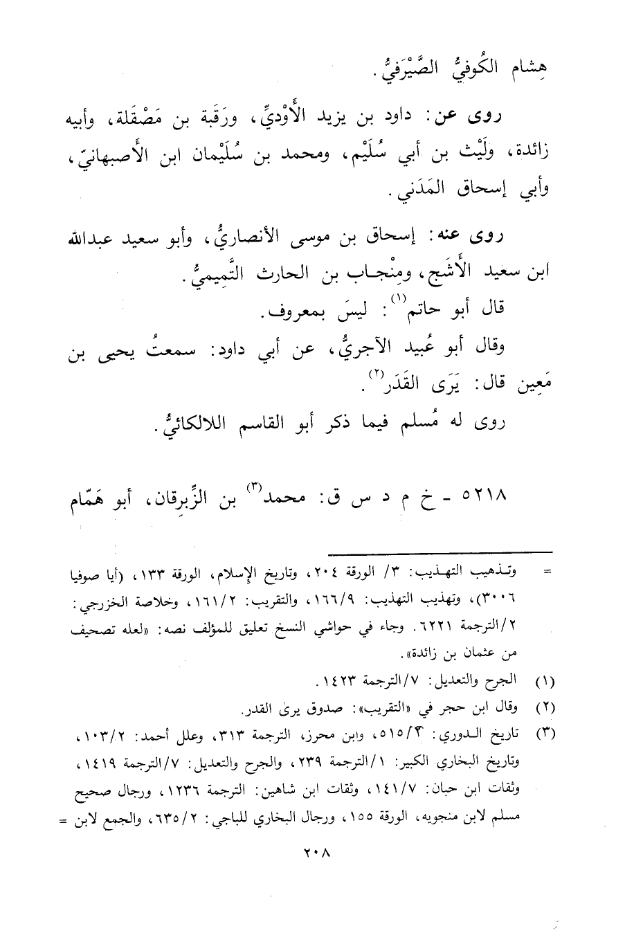 = وتذهيب التهذيب: 3 / الورقة 204، وتاريخ الاسلام: الورقة 133، (أيا صوفيا 3006) ، وتهذيب التهذيب: 9 / 166، والتقريب: 2 / 161، وخلاصة الخزرجي: 2 / الترجمة 6221. وجاء في حواشي النسخ تعليق للمؤلف نصه: "لعله تصحيف من عثمان بن زائدة.