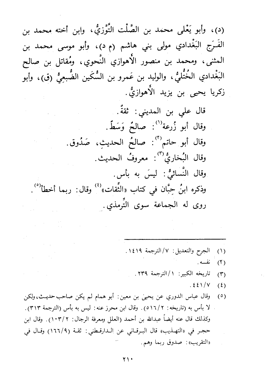 (5) وَقَال عَباس الدُّورِيُّ عَن يحيى بن مَعِين: أبو همام لم يكن صاحب حديث، ولكن لا بأس به (تاريخه: 2 / 516) . وَقَال ابن محرز عَنه: ليس به بأس (الترجمة 313) . وكذلك قال عنه أيضا عَبد الله بن أحمد (العلل ومعرفة الرجال: 2 / 103) . وَقَال ابن حجر في "التهذيب "قال البرقاني عن الدارقطني: ثقة (9 / 166) وَقَال في "التقريب": صدوق ربما وهم.