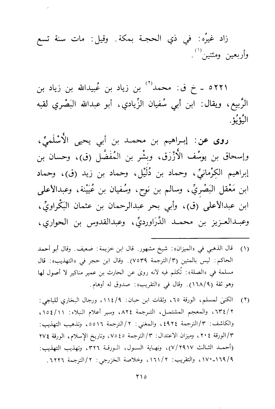 (2) الكنى لمسلم، الورقة 65، وثقات ابن حبان: 9 / 114، ورجال البخاري للباجي: 2 / 634، والمعجم المشتمل، الترجمة 824، وسير أعلام النبلاء: 11 / 154، والكاشف: 3 / الترجمة 4924، والمغني: 2 / الترجمة 5516، وتذهيب التهذيب: 3 / الورقة 204، وميزان الاعتدال: 3 / الترجمة 7545، وتاريخ الاسلام، الورقة 274 (أحمد الثالث 2917 / 7) ، ونهاية السول، الورقة 326، وتهذيب التهذيب: 9 / 169 - 170، والتقريب: 2 / 161، وخلاصة الخزرجي: 2 / الترجمة 6226.