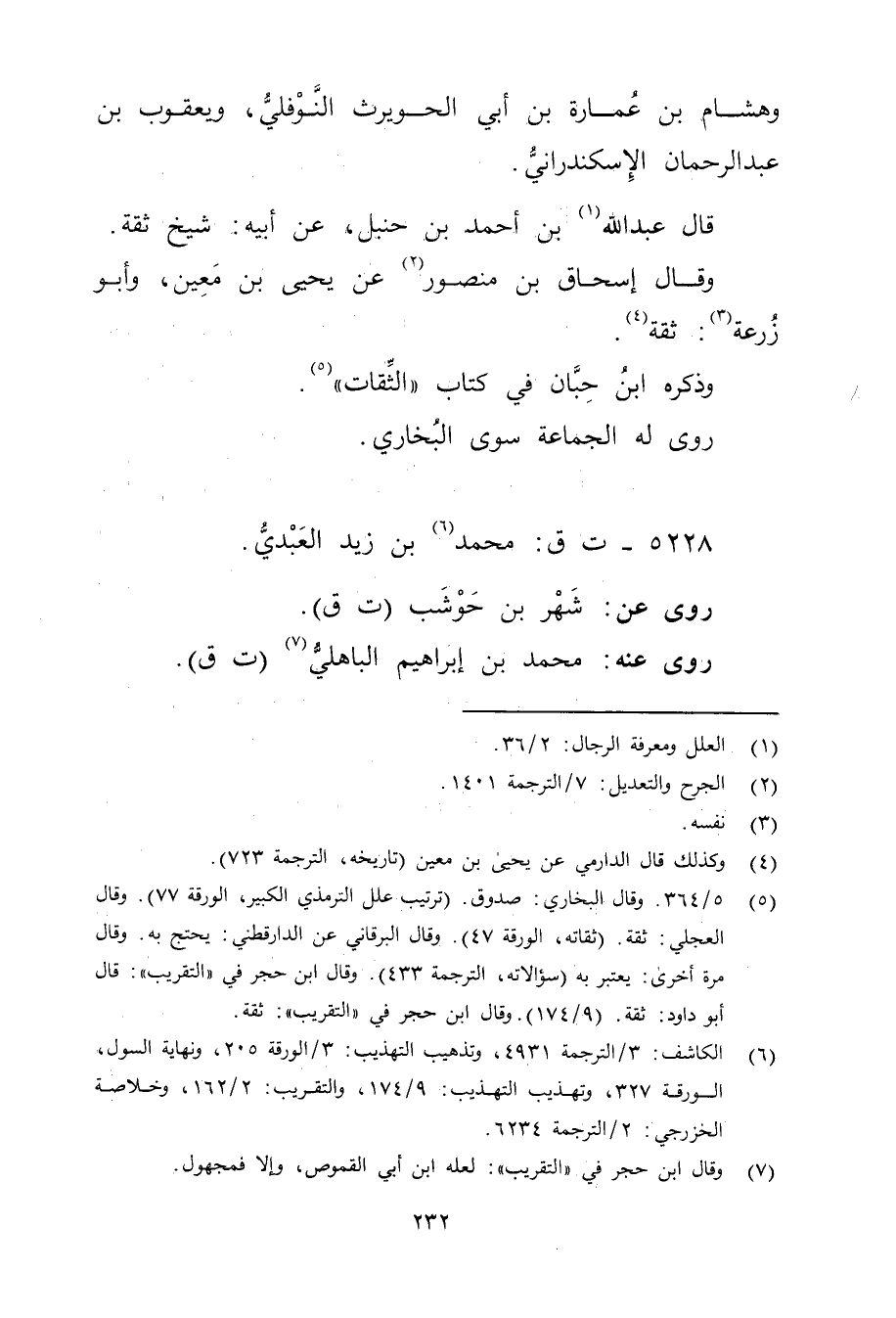 (6) الكاشف: 3 / الترجمة 4931، وتذهيب التهذيب: 3 / الورقة 205، ونهاية السول، الورقة 327، وتهذيب التهذيب: 9 / 174، والتقريب: 2 / 162، وخلاصة الخزرجي: 2 / الترجمة 6234.