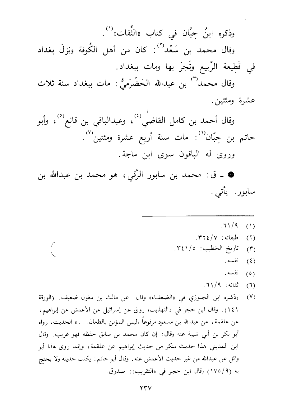 - ق: مُحَمَّد بن سابور الرَّقِّيّ، هو مُحَمَّد بن عَبد الله بن سابور. يأتي.