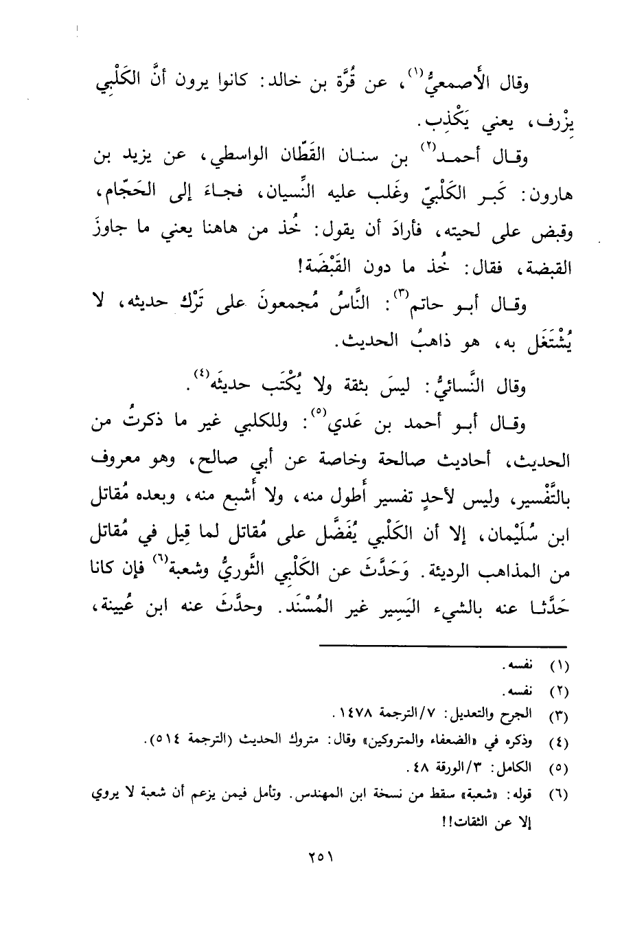 وَقَال أَبُو أَحْمَد بْن عَدِيّ (5) : وللكلبي غير ما ذكرت من الحديث، أحاديث صالحة وخاصة عَن أبي صالح، وهو معروف بالتفسير، وليس لأحد تفسير أطول منه، ولا أشبع منه، وبعده مقاتل ابن سُلَيْمان، إلا أن الكلبي يفضل على مقاتل لما قيل في مقاتل من المذاهب الرديئة. وحدث عن الكلبي الثوري وشعبة (6) فإن كانا حدثا عنه بالشئ اليسير غير المسند. وحدث عنه ابن عُيَيْنَة،