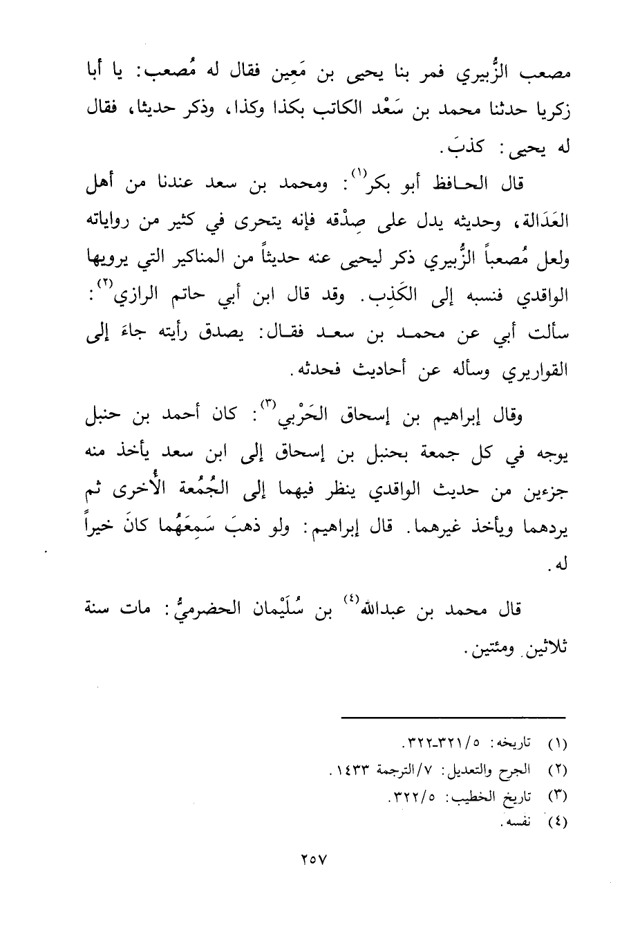 مصعب الزبيري فمر بنا يَحْيَى بْن مَعِين فقال له مصعب: يا أبا زكريا حَدَّثَنَا مُحَمَّد بْن سَعْد الكاتب بكذا وكذا، وذكر حديثا، فقال له يَحْيَى: كذب.