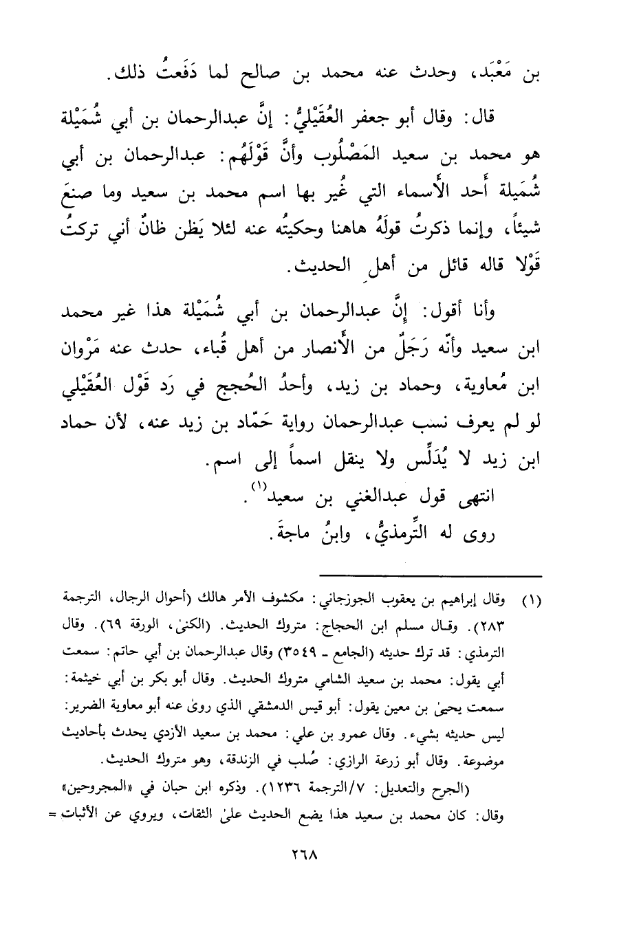 قال: وَقَال أَبُو جعفر العقيلي: أن عَبْد الرَّحْمَنِ بْن أَبي شميلة هو مُحَمَّد بْن سَعِيد المصلوب وأن قولهم: عبد الرحمن بْن أَبي شميلة أحد الأَسماء التي غير بها اسم مُحَمَّد بْن سَعِيد وما صنع شيئا، وإنما ذكرت قوله ها هنا وحكيته عنه لئلا يظن ظان أني تركت قولا قاله قائل هو أهل الحديث.