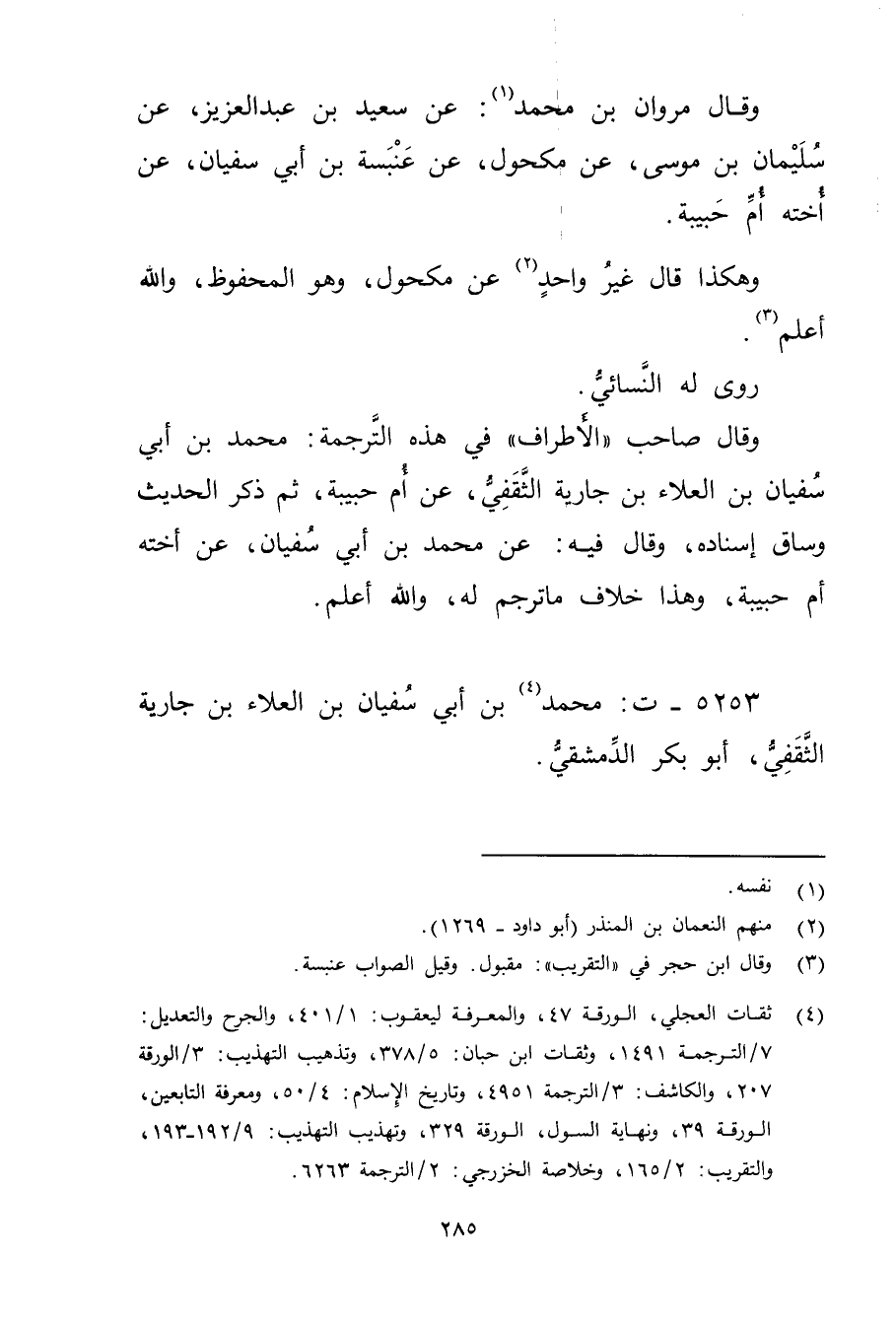 وَقَال مروان بْن مُحَمَّد (1) : عن سَعِيد بْن عبد العزيز، عن سُلَيْمان بْن موسى، عَنْ مكحول، عن عنبسة بْن أَبي سفيان، عن أخته أم حبيبة.