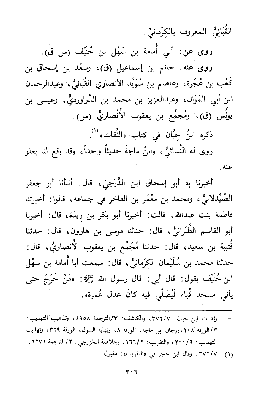أَخْبَرَنَا بِهِ أَبُو إِسْحَاقَ ابْنُ الدَّرَجِيِّ، قال: أنبأنا أَبُو جَعْفَرٍ الصَّيْدَلانِيُّ، ومُحَمَّدُ بْنُ مَعْمَرِ بْنِ الْفَاخِرِ فِي جَمَاعَةٍ، قَالُوا: أَخْبَرَتْنَا فَاطِمَةُ بِنْتُ عَبد اللَّهِ، قَالَتْ: أخبرنا أَبُو بَكْرِ بْنُ رِيذَةَ، قال: أخبرنا أَبُو الْقَاسِمِ الطَّبَرَانِيُّ، قال: حَدَّثَنَا موسى بْن هارون، قال: حَدَّثَنَا قُتَيْبَةُ بْنُ سَعِيد، قال: حَدَّثَنَا مُجَمِّعُ بْنُ يَعْقُوبَ الأَنْصارِيّ، قال: حَدَّثَنَا مُحَمَّدُ بْنُ سُلَيْمان الْكِرْمَانِيُّ، قال: سَمِعْتُ أَبَا أمامة بن سهل ابن حَنِيفٍ يَقُولُ: قال أَبِي: قال رَسُول اللَّهِ صلى الله عليه وسَلَّمَ: "مَنْ خَرَجَ حَتَّى يَأْتِي مَسْجِدَ قُبَاءٍ فَيُصَلِّي فِيهِ كَانَ عدل عُمَرة.