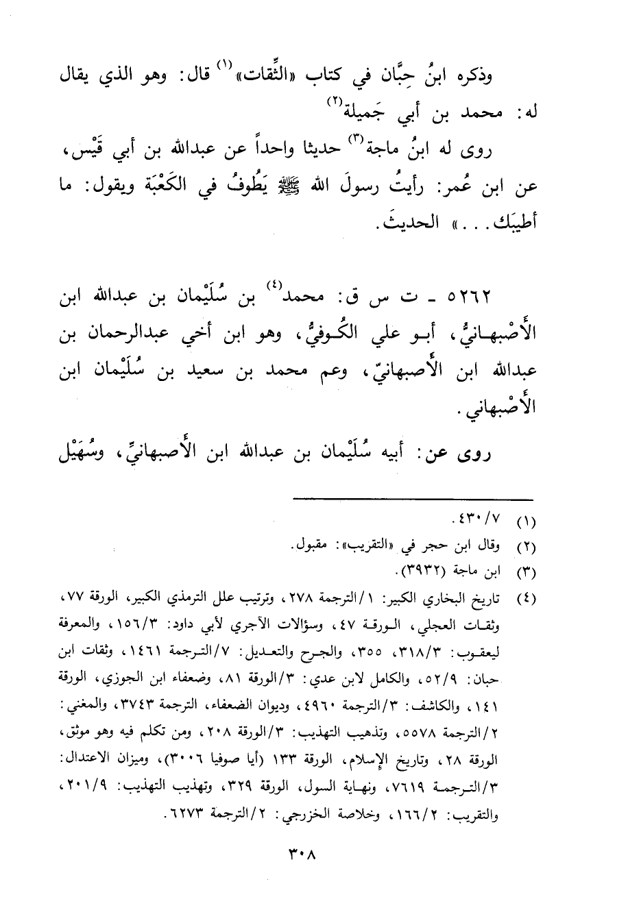5262 - ت س ق: مُحَمَّد بن سُلَيْمان بْن عَبد اللَّه بْن الأصبهاني (4) ، أَبُو علي الكوفي، وهو ابن أخي عَبْد الرحمن بْن عَبد اللَّه بْن الأصبهاني، وعم مُحَمَّد بن سَعِيد بن سُلَيْمان ابن الأصبهاني.