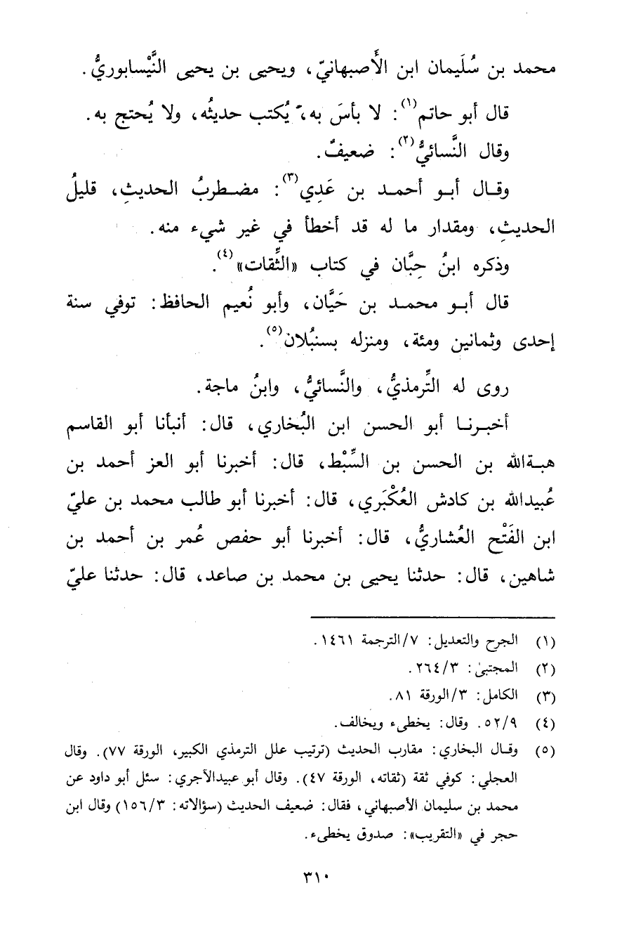 (5) وقَال البُخارِيُّ: مقارب الحديث (ترتيب علل التِّرْمِذِيّ الكبير، الورقة 77) . وَقَال العجلي: كوفي ثقة (ثقاته، الورقة 47) . وَقَال أَبُو عُبَيد الآجري: سئل أَبُو داود عَنْ مُحَمَّد بْن سُلَيْمان الأصبهاني، فقال: ضعيف الحديث (سؤالاته: 3 / 156) وَقَال ابن حجر في "التقريب": صدوق يخطئ.