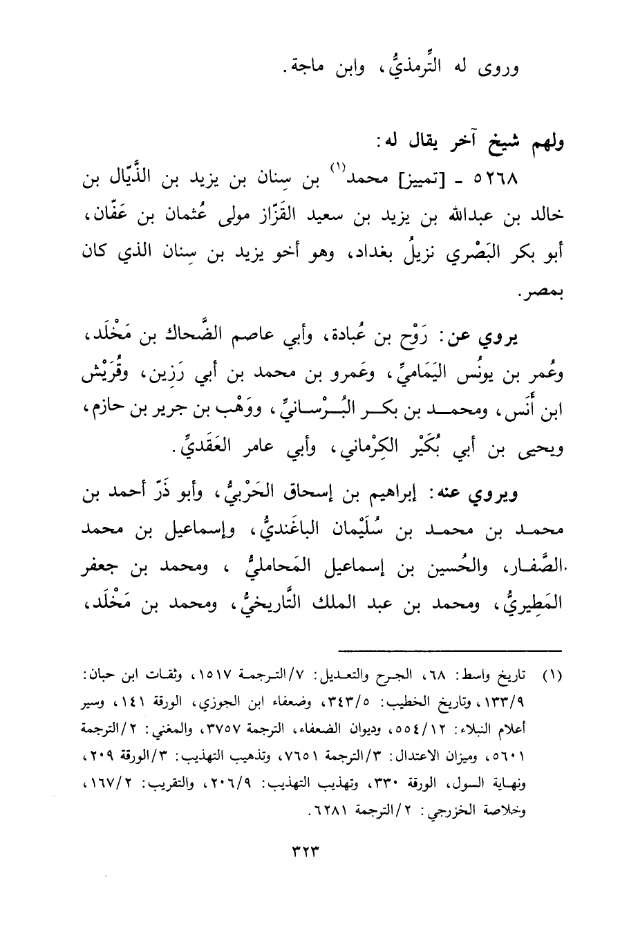 (1) تاريخ واسط: 68، الجرح والتعديل: 7 / الترجمة 1517، وثقات ابن حبان: 9 / 133، وتاريخ الخطيب: 5 / 343، وضعفاء ابن الجوزي، الورقة 141، وسير أعلام النبلاء: 12 / 554، وديوان الضعفاء، الترجمة 3757، والمغني: 2 / الترجمة 5601، وميزان الاعتدال: 3 / الترجمة 7651، وتذهيب التهذيب: 3 / الورقة 209، ونهاية السو ل، الورقة 330، وتهذيب التهذيب: 9 / 206، والتقريب: 2 / 167، وخلاصة الخزرجي: 2 / الترجمة 6281.