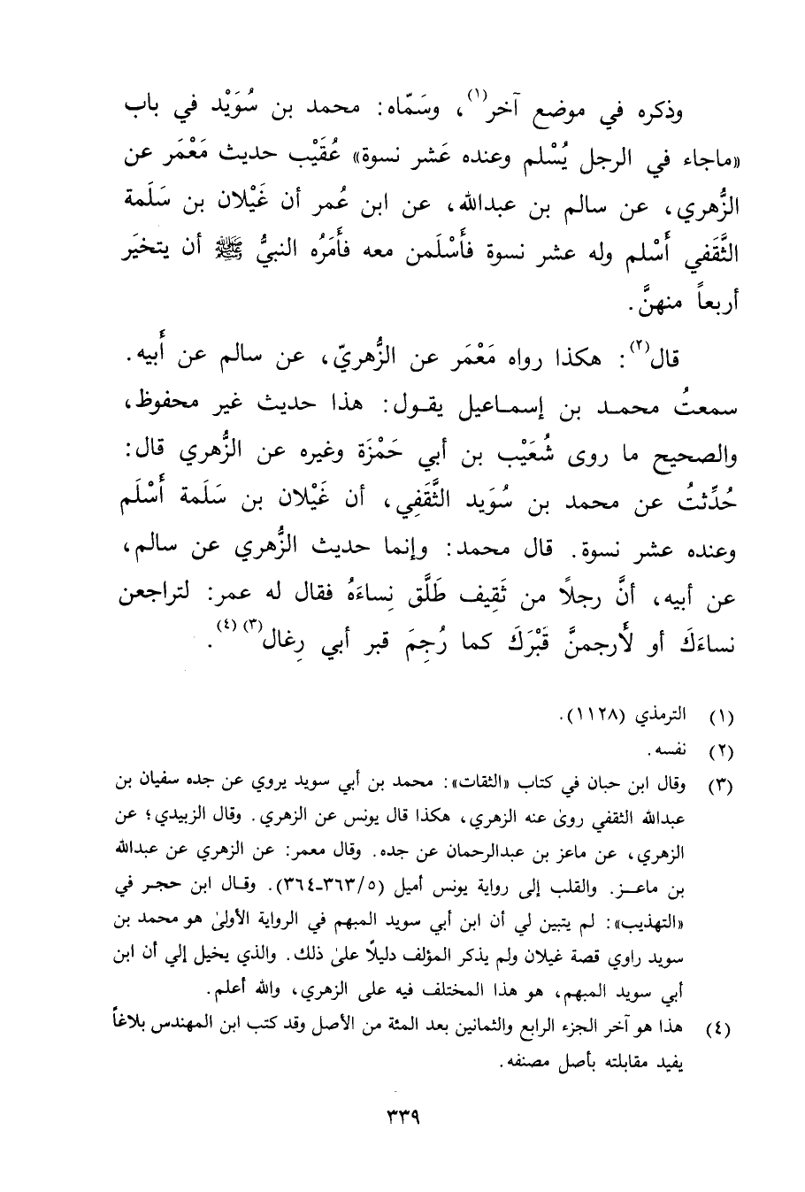 وذَكَرَهُ فِي مَوْضِعٍ آخَرَ (1) ، وسَمَاهُ: مُحَمَّدُ بْنُ سُوَيْدٍ فِي بَابِ "مَا جَاءَ فِي الرَّجُلِ يُسْلِمُ وعِنْدَهُ عَشْرُ نِسْوَةٍ "عُقَيْبَ حَدِيثِ معمر عن الزُّهْرِيّ، عن سالم بْنِ عَبد اللَّهِ، عَنِ ابْنِ عُمَر أَنَّ غَيْلانَ بْنَ سَلَمَةَ الثَّقَفِيَّ أَسْلَمَ ولَهُ عَشْرُ نِسْوَةٍ فَأَسْلَمْنَ مَعَهُ فَأَمَرَهُ النَّبِيُّ صَلَّى اللَّهُ عَلَيْهِ وسَلَّمَ أَنْ يَتَخَيَّرَ أَرْبَعًا مِنْهُنَّ.