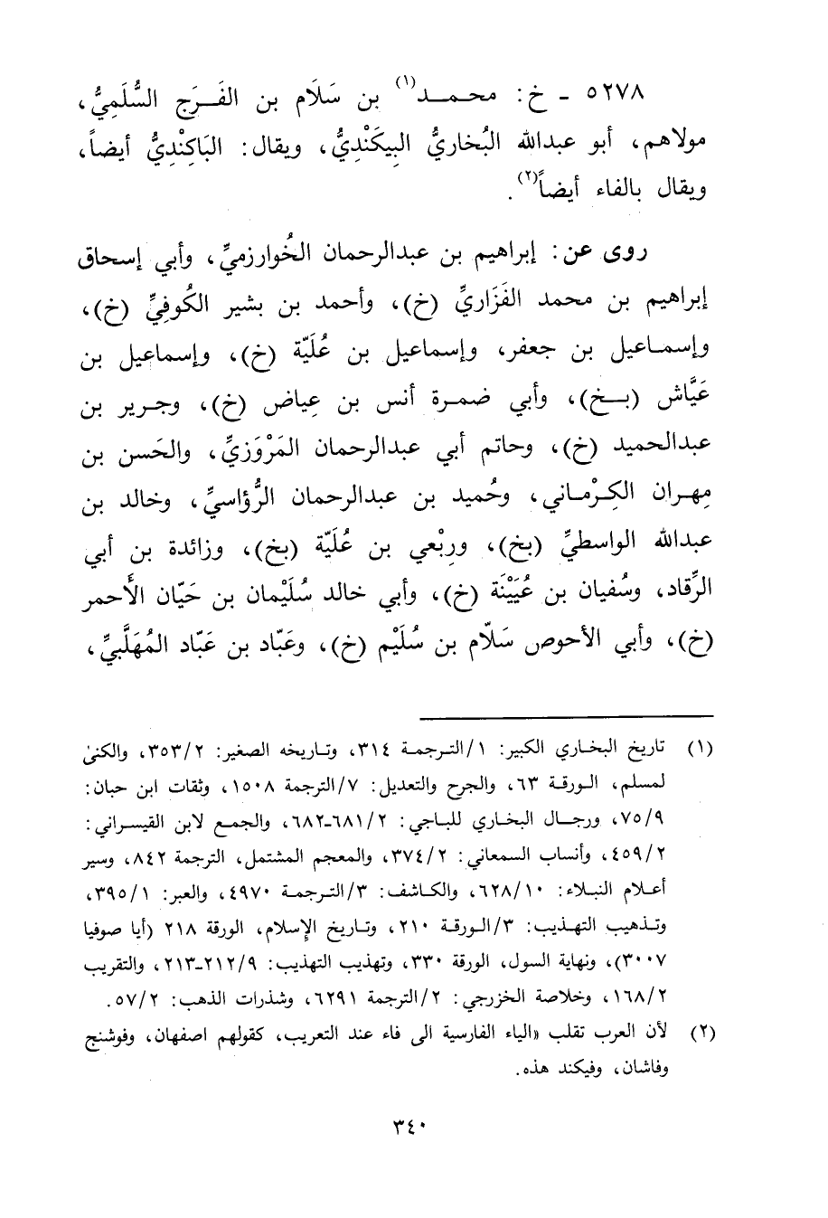 5278 - خ: مُحَمَّد بن سلام بن الفرج السلمي (1) ، مولاهم، أَبُو عبد اللَّه البخاري البيكندي، ويُقال: الباكندي أيضا، ويُقال بالفاء أيضا (2) .
