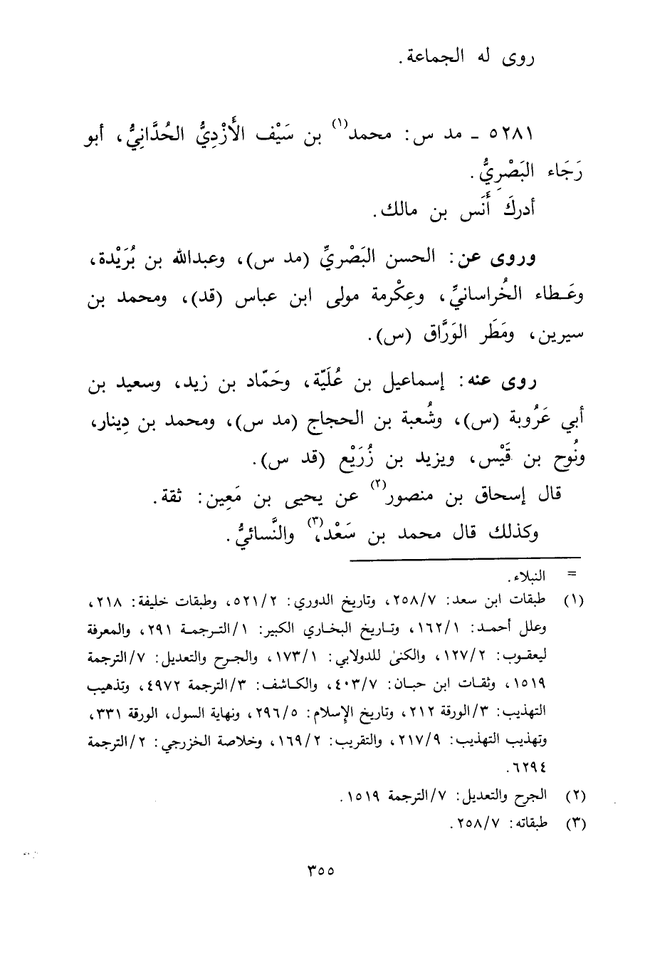 5281 - مد س: مُحَمَّد بن سيف الأزدي الحداني (1) ، أَبُو رجاء البَصْرِيّ. أدرك أنس بْن مالك.
