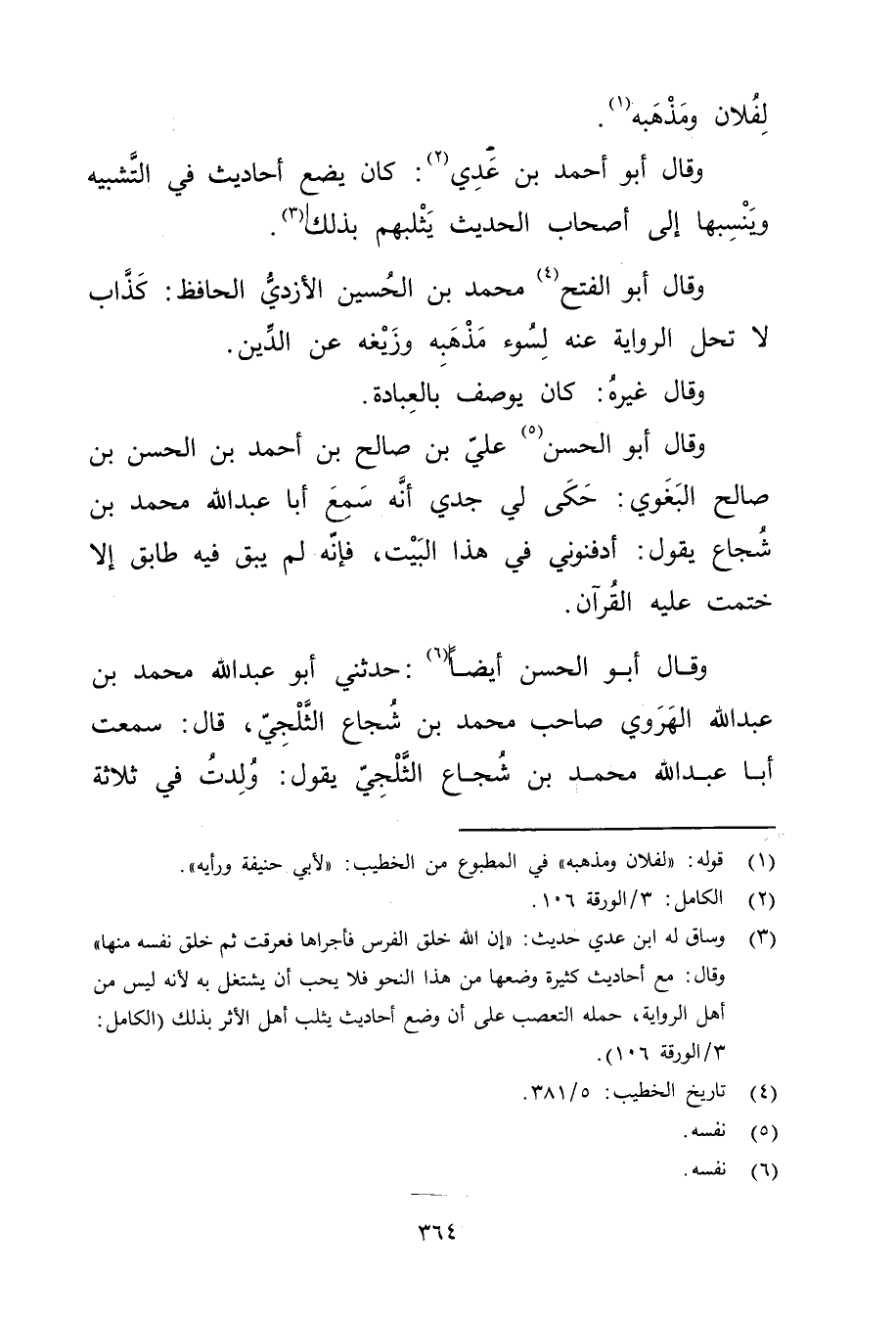 وَقَال أَبُو الْحَسَن أيضا (6) : حَدَّثَنِي أَبُو عَبْد اللَّهِ مُحَمَّد بْن عَبد اللَّه الهروي صاحب مُحَمَّد بْن شجاع الثلجي، قال: سمعت أبا عَبد اللَّه مُحَمَّد بْن شجاع الثلجي يقول: ولدت في ثلاثة