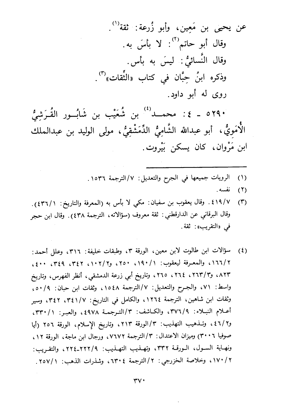 (4) سؤالات ابن طالوت لابن مَعِين، الورقة 3، وطبقات خليفة: 316، وعلل أحمد: 2 / 166، والمعرفة ليعقوب: 1 / 190، 250، و2 / 102، 342، 349، 400، 823، و3 / 263، 264، 265، وتاريخ أبي زرعة الدمشقي، انظر الفهرس، وتاريخ واسط: 71، والجرح والتعديل: 7 / الترجمة 1548، وثقات ابن حبان: 9 / 50، وثقات ابن شاهين، الترجمة 1264، والكامل في التاريخ: 7 / 341، 342، وسير أعلام النبلاء: 9 / 376، والكاشف: 3 / الترجمة 4978، والعبر: 1 / 330، و2 / 46، وتذهيب التهذيب: 3 / الورقة 213، وتاريخ الاسلام، الورقة 256 (أيا صوفيا 3006) وميزان الاعتدال: 3 / الترجمة 7672، ورجال ابن ماجة، الورقة 12، ونهاية السول، الورقة 332، وتهذيب التهذيب: 9 / 222 - 224، والتقريب: 2 / 170، وخلاصة الخزرجي: 2 / الترجمة 6304، وشذرات الذهب: 2 / 257.