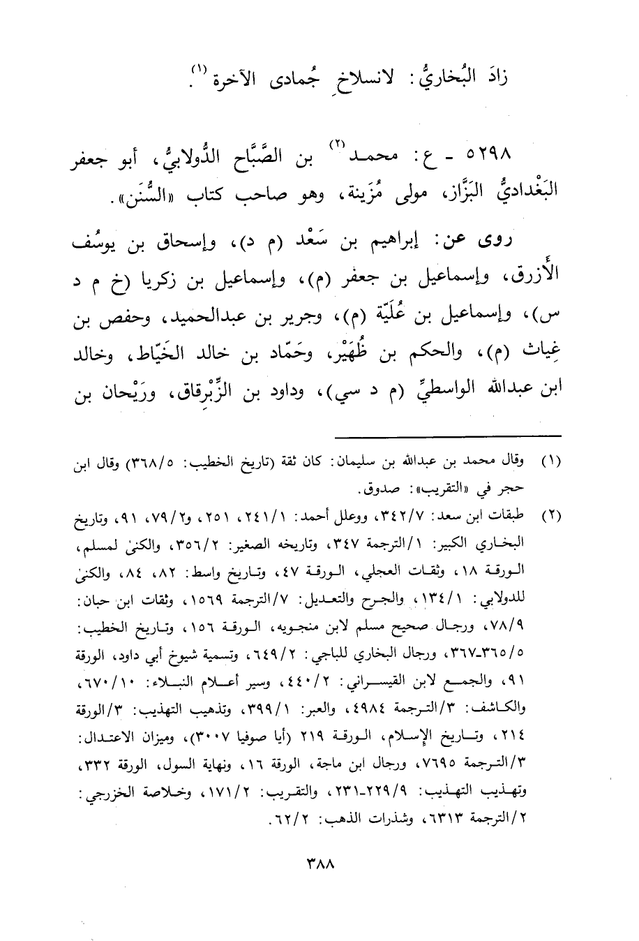 5298 - ع: مُحَمَّد بن الصباح الدولابي (2) ، أَبُو جعفر البغدادي البزاز، مولى مزينة، وهو صاحب كتاب "السنن.