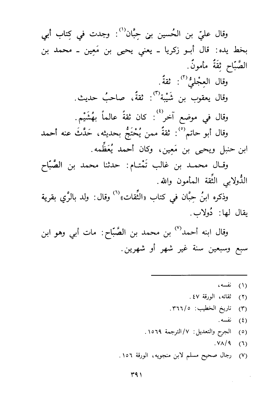 وَقَال علي بْن الحسين بْن حبان (1) : وجدت فِي كتاب أَبِي بخط يده: قال أبو زكريا، يَعْنِي يَحْيَى بْن مَعِين - مُحَمَّد بْن الصباح ثقة مأمون.