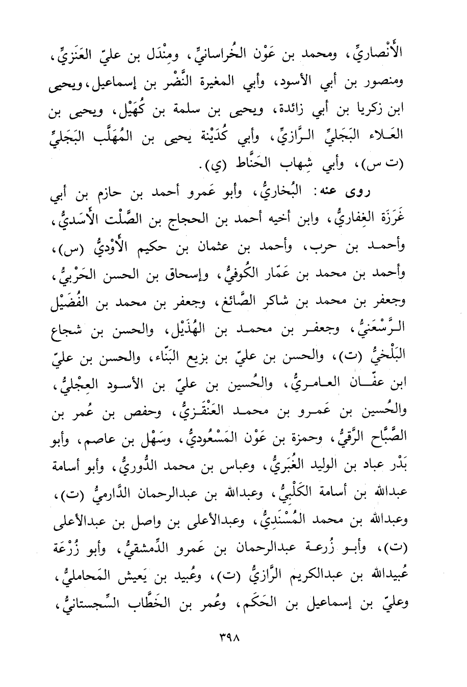 الأَنْصارِيّ، ومُحَمَّد بْن عون الخراساني، ومندل بن علي العنزي، ومنصور بْن أَبي الأسود، وأبي المغيرة النضر بن إسماعيل، ويحيى ابن زكريا بْن أَبي زائدة، ويحيى بْن سَلَمَة بْن كُهَيْل، ويحيى بْن العلاء البجلي الرازي، وأبي كدينة يحيى بن المهلب البجلي (ت س) ، وأبي شهاب الحناط (ي) .