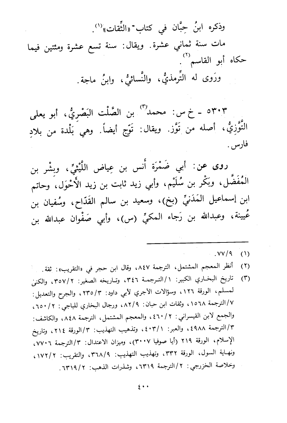 (3) تاريخ البخاري الكبير: 1 / الترجمة 346، وتاريخه الصغير: 2 / 357، والكنى لمسلم، الورقة 126، وسؤالات الآجري لابي داود: 3 / 235، والجرح والتعديل: 7 / الترجمة 1568، وثقات ابن حبان: 9 / 82، ورجال البخاري للباجي: 2 / 650، والجمع لابن القيسراني: 2 / 460، والمعجم المشتمل، الترجمة 848، والكاشف: 3 / الترجمة 4988، والعبر: 1 / 403، وتذهيب التهذيب: 3 / الورقة 214، وتاريخ الاسلام، الورقة 219 (أيا صوفيا 3007) ، وميزان الاعتدال: 3 / الترجمة 7706، ونهاية السول، الورقة 332، وتهذيب التهذيب: 9 / 368، والتقريب: 2 / 172، وخلاصة الخزرجي: 2 / الترجمة 6319، وشذرات الذهب: 2 / 6319.