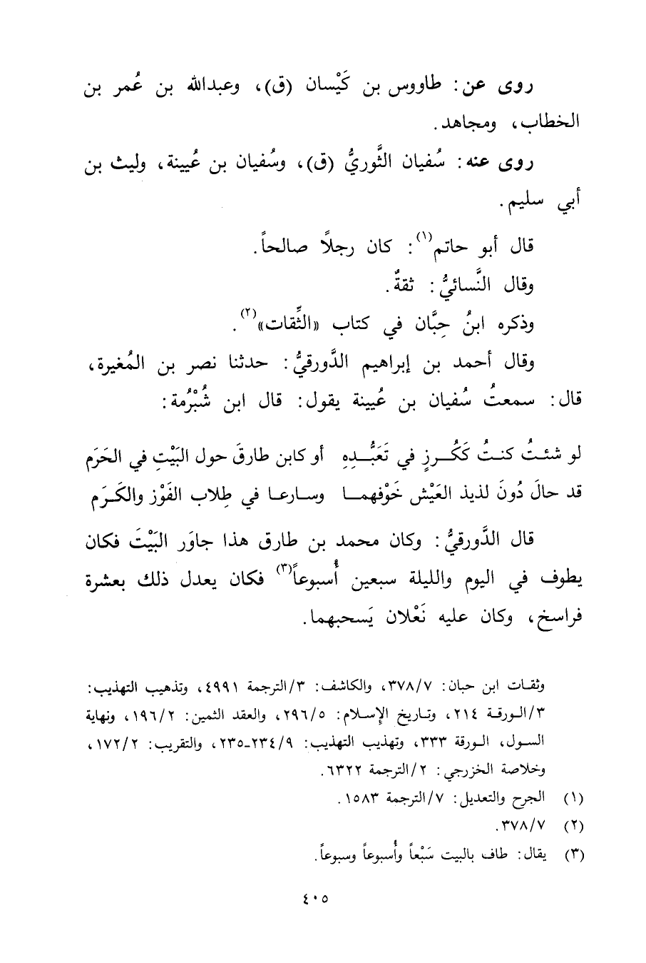 قال الدورقي: وكان مُحَمَّد بْن طارق هذا جاور البيت فكان يطوف في اليوم والليلة سبعين أسبوعا (3) فكان يعدل ذلك بعشرة فراسخ، وكان عليه نعلان يسحبهما.
