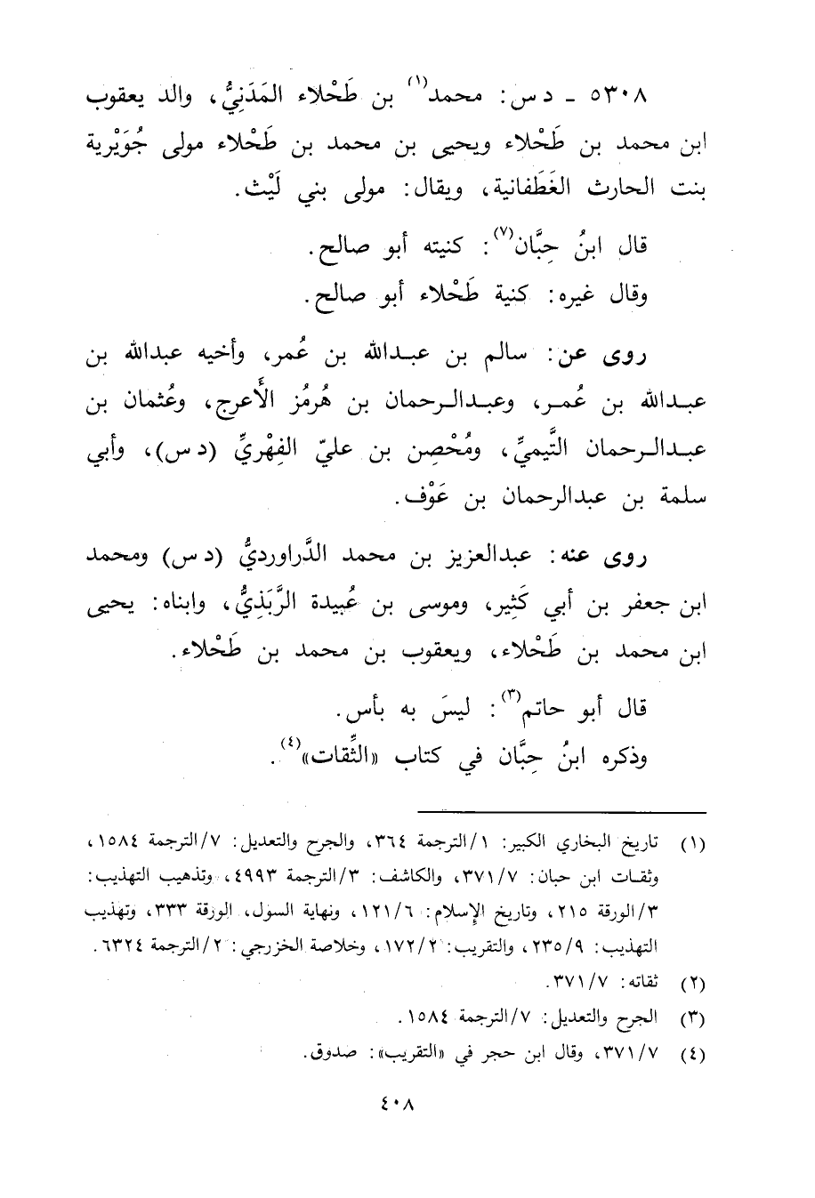 5308 - د س: مُحَمَّد بن طحلاء المدني (1) ، والد يعقوب ابن مُحَمَّد بْن طحلاء ويَحْيَى بْن مُحَمَّد بْن طحلاء مولى جويرية بنت الحارث الغطفانية، ويُقال: مولى بني ليث.