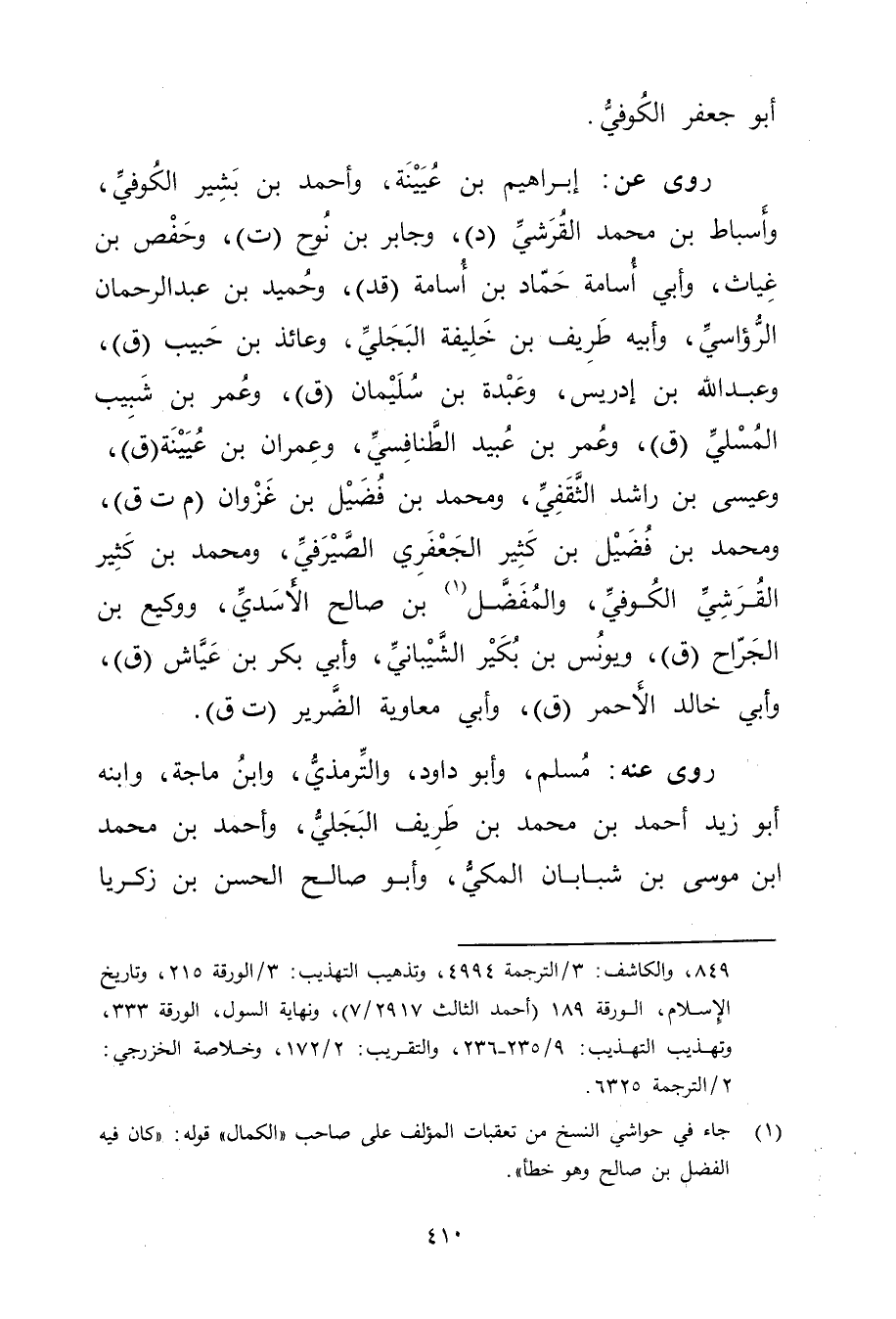 (1) جاء في حواشي النسخ من تعقبات المؤلف على صاحب "الكمال "قوله: "كان فيه الفضل بن صالح وهو خطأ ".