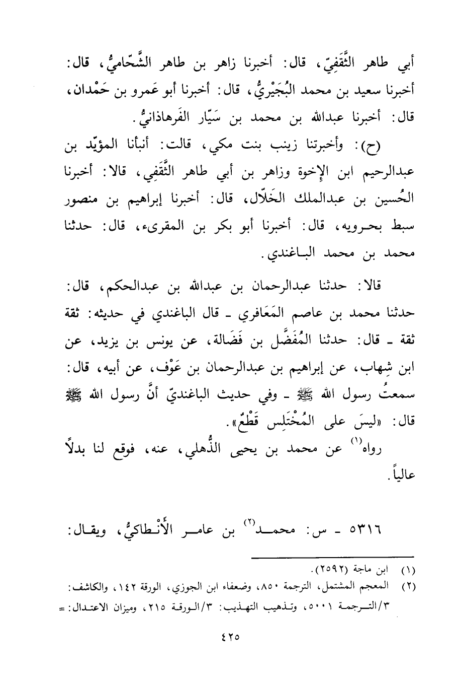 أَبِي طَاهِرٍ الثَّقَفِيُّ، قال: أخبرنا زَاهِرُ بْنُ طَاهِرٍ الشَّحَّامِيُّ، قال: أَخْبَرَنَا سَعِيد بْنُ مُحَمَّدٍ الْبُجَيْرِيُّ، قال: أخبرنا أَبُو عَمْرو بْنُ حَمْدَانَ، قال: أَخْبَرَنَا عَبد اللَّهِ بْن مُحَمَّد بْن سَيَّار الفرهاذاني.