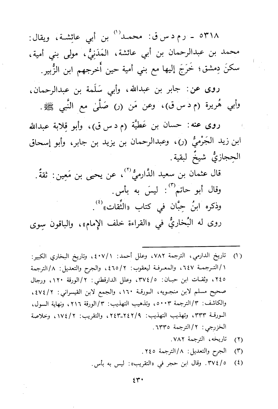 5318 - ر م د س ق: مُحَمَّد بن أَبي عائشة (1) ، ويُقال: مُحَمَّد بْن عَبْد الرَّحْمَنِ بْن أَبي عائشة، المدني، مولى بني أمية، سكن دمشق، خرج إليها مع بني أمية حين أخرجهم ابن الزبير.