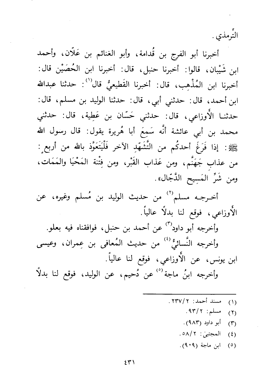 أَخْبَرَنَا أَبُو الْفَرَجِ بْنُ قُدَامَةَ، وأَبُو الْغَنَائِمِ بْنُ عَلانَ، وأَحْمَدُ بْنُ شَيْبَانَ، قَالُوا: أَخْبَرَنَا حنبل، قال: أخبرنا ابن الحصين قال: أخبرنا ابْنُ الْمُذْهِب، قال: أخبرنا القَطِيعِيّ قال (1) : حَدَّثَنَا عَبد اللَّهِ بْن أَحْمَدَ، قال: حَدَّثني أَبِي، قال: حَدَّثَنَا الْوَلِيدُ بْنُ مُسْلِمٍ، قال: حَدَّثَنَا الأَوزاعِيّ، قال: حَدَّثَنِي حَسَّانُ بْنُ عَطِيَّةَ، قال: حَدَّثَنِي مُحَمَّدُ بْنُ أَبي عَائِشَةَ أَنَّهُ سَمِعَ أَبَا هُرَيْرة يَقُولُ: قال رَسُولُ اللَّهِ صلى الله عَلَيْهِ وَسَلَّمَ: إِذَا فَرَغ أَحَدُكُمْ مِنَ التَّشَهَّدِ الآخَرِ فَلْيَتَعَوَّذْ بِاللَّهِ مِنْ أَرْبَعٍ: مِنْ عَذَابِ جَهَنَّمٍ، ومِنْ عَذَابِ الْقَبْرِ، ومِنْ فِتْنَةِ الْمَحْيَا والْمَمَاتِ، ومِنْ شَرِّ الْمَسِيحِ الدَّجَّالِ.