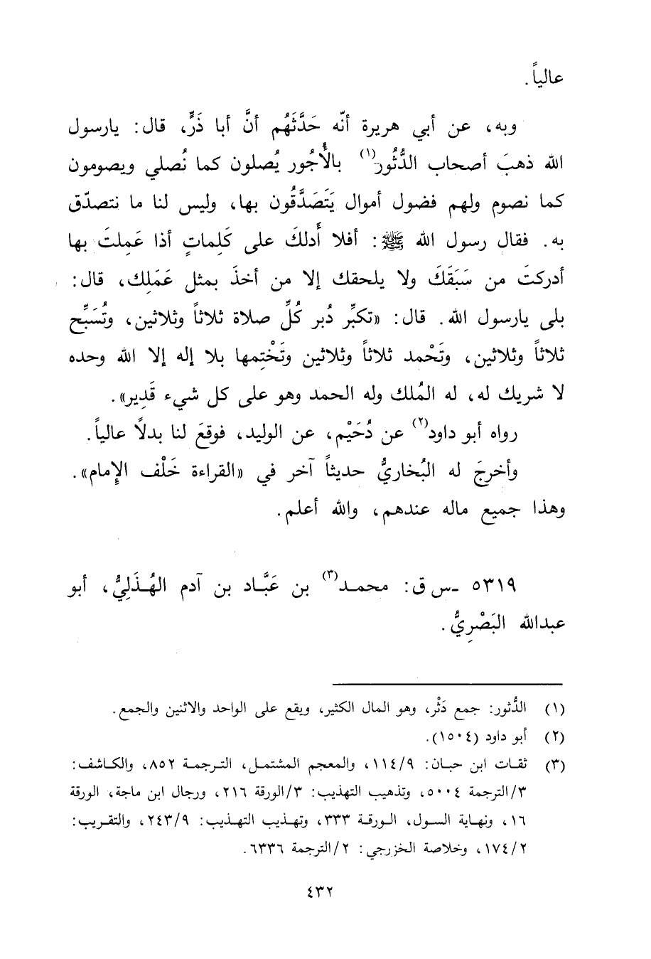 وبِهِ، عَنْ أَبِي هُرَيْرة أَنَّهُ حَدَّثَهُمْ أَنَّ أَبَا ذَرٍّ، قال: يَا رَسُولَ اللَّهِ ذَهَبَ أَصْحَابُ الدُّثُورِ (1) بِالأُجُورِ يُصَلُّونَ كَمَا نُصَلِّي ويَصُومُونَ كَمَا نَصُومُ ولَهُمْ فُضُولُ أَمْوَالٍ يَتَصَدَّقُونَ بِهَا، ولَيْسَ لَنَا مَا نَتَصَدَّقُ بِهِ. فَقَالَ رَسُول اللَّهِ صلى الله عليه وسلم: أَفَلا أَدُلُّكَ عَلَى كَلِمَاتٍ إِذَا عَمِلْتَ بِهَا أَدْرَكْتَ مَنْ سَبَقَكَ ولا يَلْحَقَكَ إِلا مَنْ أَخَذَ بِمِثْلِ عَمَلِكَ، قال: بَلَى يَا رَسُولَ اللَّهِ. قال: تُكَبِّرُ دُبُرِ كُلِّ صَلاةٍ ثَلاثًا وثَلاثِينَ، وتُسَبِّحُ ثَلاثًا وثَلاثِينَ، وتَحْمِدُ ثَلاثًا وثَلاثِينَ وتَخْتِمُهَا بِلا إِلَهَ إِلا اللَّه وحده لا شَرِيك له، لَهُ الْمُلْكُ ولَهُ الْحَمْدُ وهُوَ عَلَى كُلِّ شَيْءٍ قَدِيرٍ.